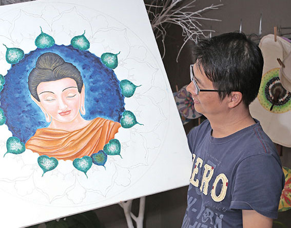 他也喜爱将他在日常生活中或旅游期间心的体会、心的感觉,表露在一幅幅的曼陀罗里。就如在一次画展中,他看到一头牛的作品,是由碎布制作而成的,便尝试将同样的做法用在绘制曼陀罗中,虽然没有讲求对称,但却呈现了另一番艺术作风。而在一次去泰国旅行回来后,他以卡通方式画了十只大象手牵手围成圆圈的曼陀罗,呈现了当地人热情友善的一面。