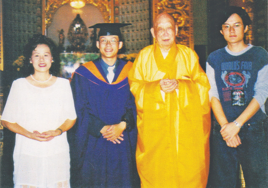 永怀恩师深似海,那一年,陈淑娴带着穿上大学毕业学士袍的长子李岳峰,到观音亭与老师父合照,感谢师父经常为其多病的孩子祈福与鼓励,然而老师父有一阵子都因病入院,大家都很焦急,一直求佛菩萨加持,拍照那天老师父刚病愈出院,陈淑娴一家人与老师父在大雄宝殿拍照,感动温馨的画面,如今成了她无尽忆思;常存在心中的一部经典——。