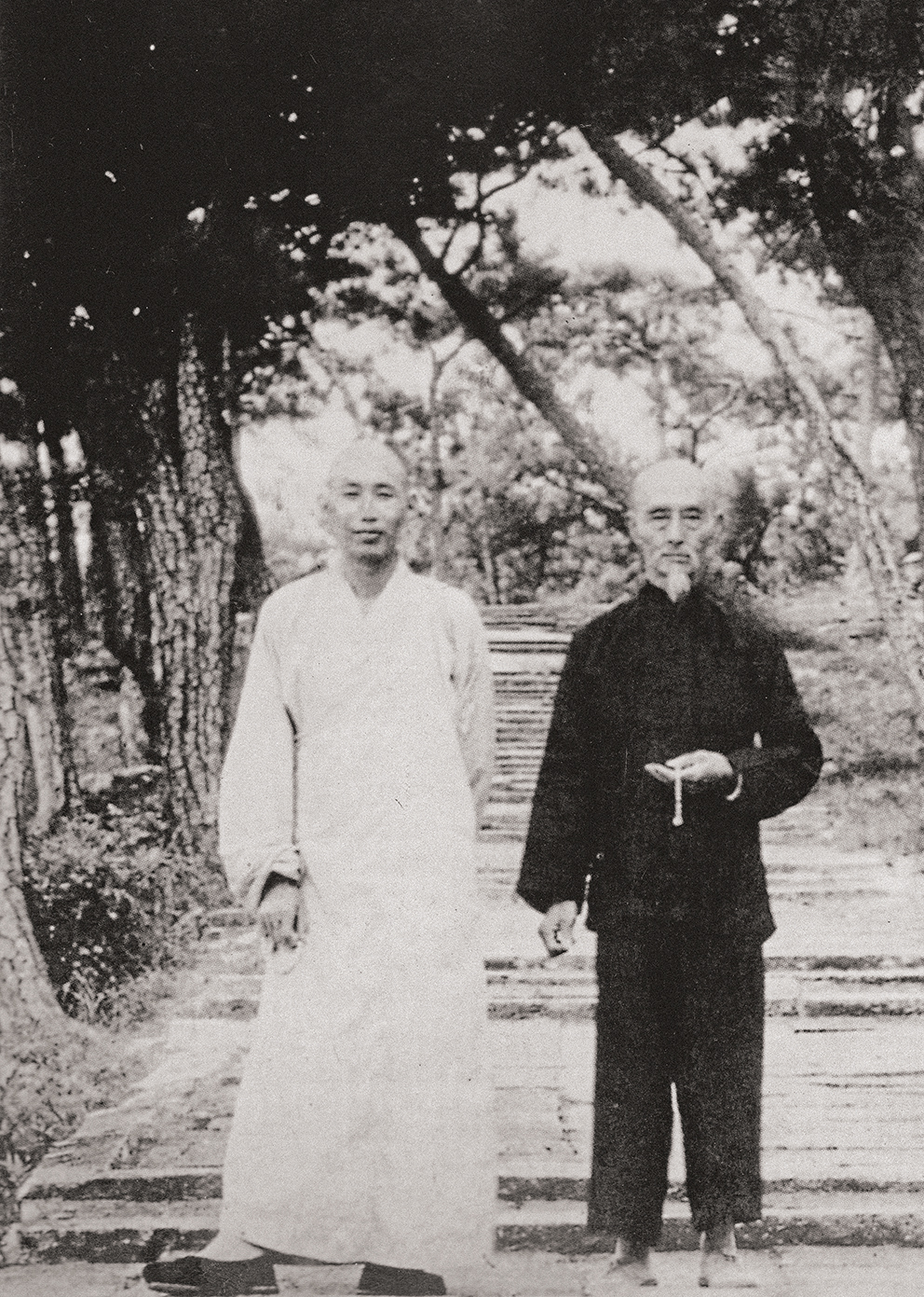 山中小径,一俊朗青年陪伴虚云老和尚漫步。
