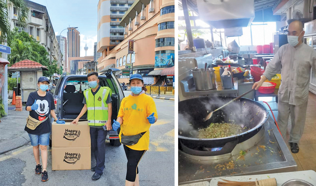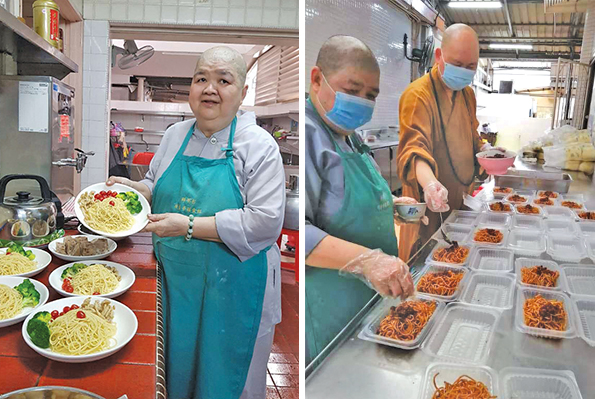 行动管制期间,明彤法师(左)因不忍众生苦而发心烹煮500盒素食饭盒发放给此次疫情的贫困人士,观音亭住持明吉法师(右)也来出一份力。