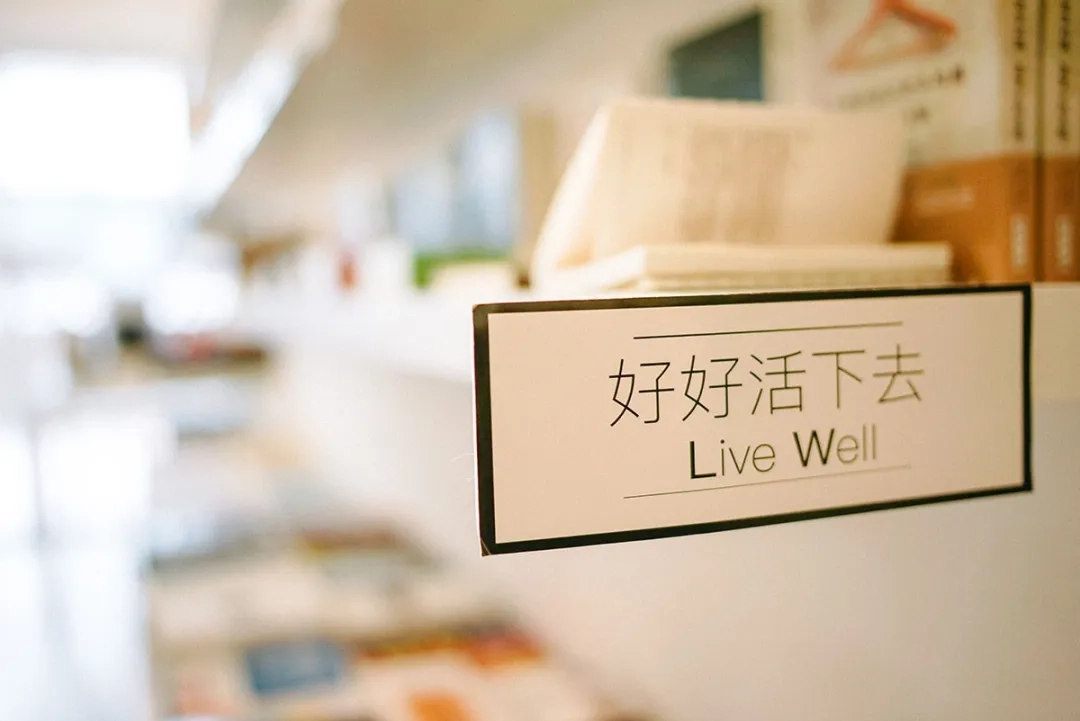 书社设计以简约素白为主,走进那窄长的铺位,首先看见的,是白色墙身上张贴的四块展板,感觉就像走进一个艺文空间。其中三块展板依次写着「终有一死」、「身不由己」,最后一块「好好活下去」的展板被聚光灯照着,仿佛成了舞台的主角,也是唯一一个题目没有相关书籍分类。