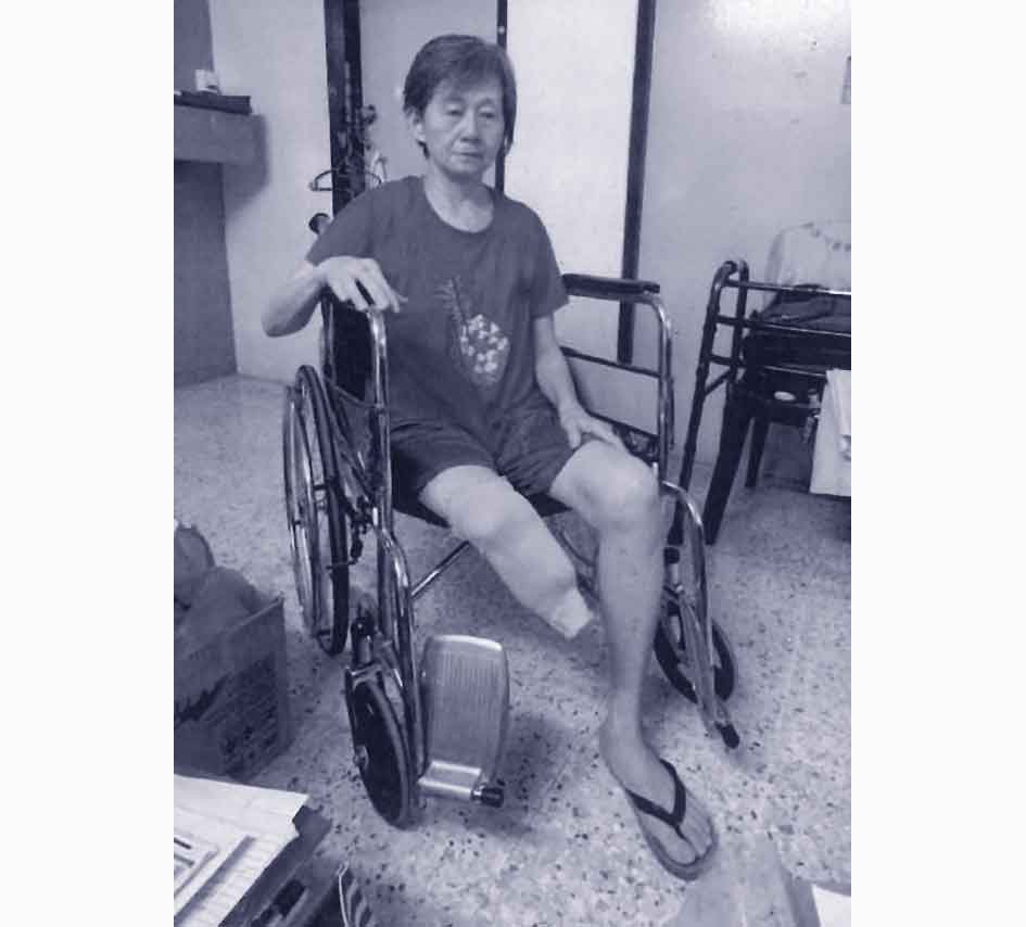 李月明(61岁)因车祸失掉右小腿,不良于行,又不幸患有心脏病及忧郁症,本身是单身,一个人住,家人没有帮忙,生活一个人渡过,甚是无助,困苦,哀!