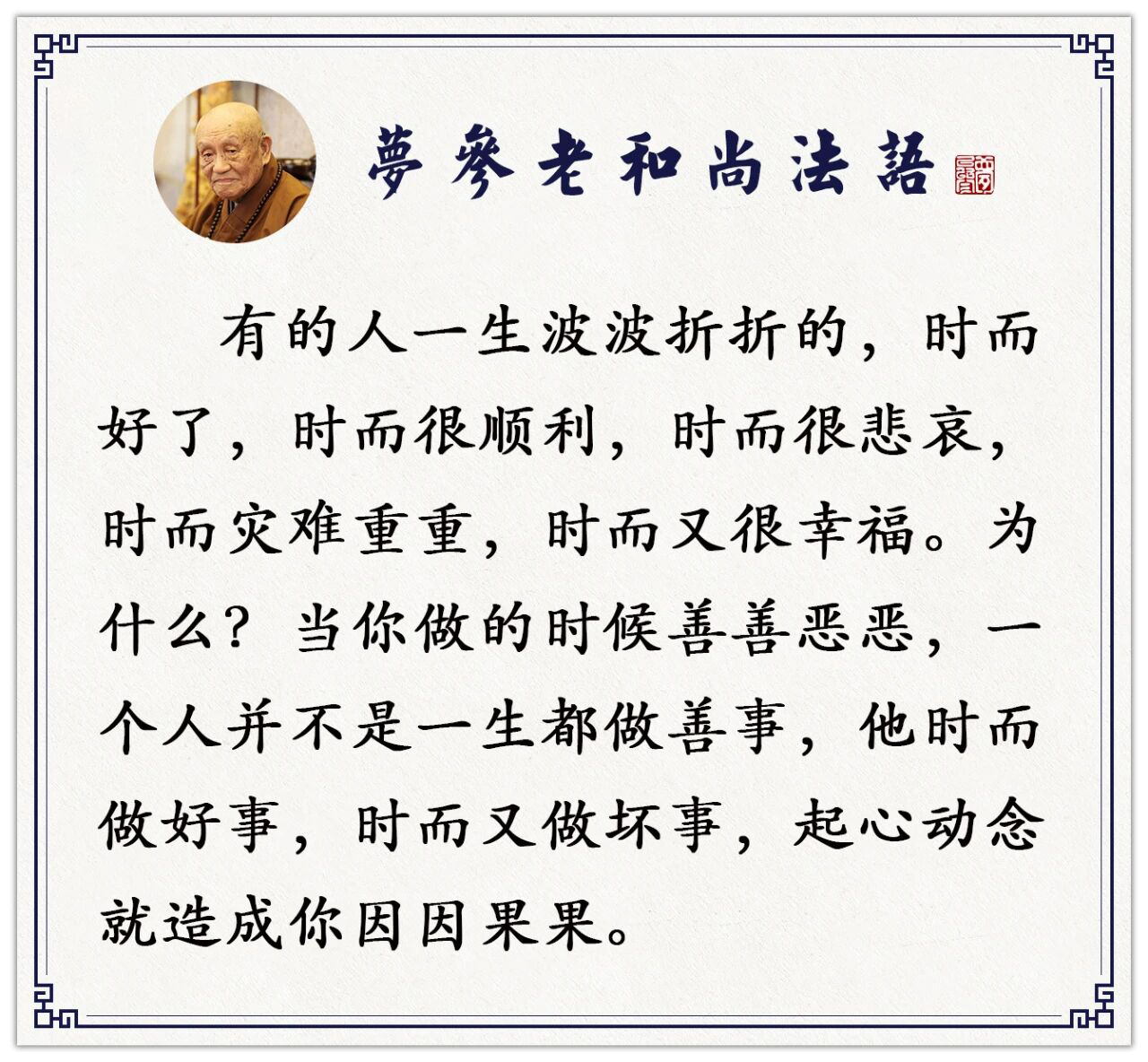 你这样来认识世间,你心里头不会起波浪,为什么?因果报应,很简单,这样子你心里头非常平衡。但是你想帮助这个人,看他很苦难,你得先转他的因。怎么把他那个因消了,这就是靠佛菩萨加持力了,把他过去造的因忏悔掉,忏悔、悔改,再不做了,发愿去帮助别人,那才能把这个转了。但是同时在一生当中,因果很复杂,一个人丧终,大家都怪老天爷不公,我感觉非常好笑,因为他不知道。