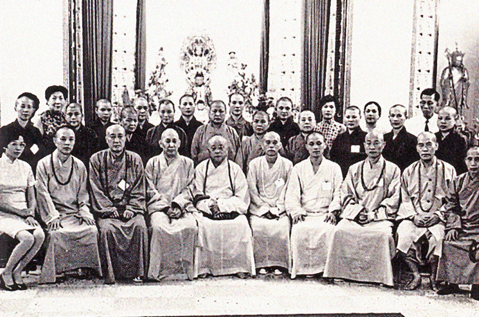 煮云长老一行人访马,与本地高僧大德合照留影,前排左三为煮云长老,左四为镜盦长老,中为白圣长老。