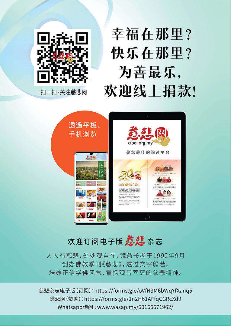 现在也推出内容相同的电子版《慈悲》杂志,1年4期 只需RM 40,为了回馈30年来的《慈悲》杂志读者的热心护持,凡订阅电子版《慈悲》杂志3年;即赠阅《慈悲食谱》第2集,有关订阅详情请浏览《慈悲网》。