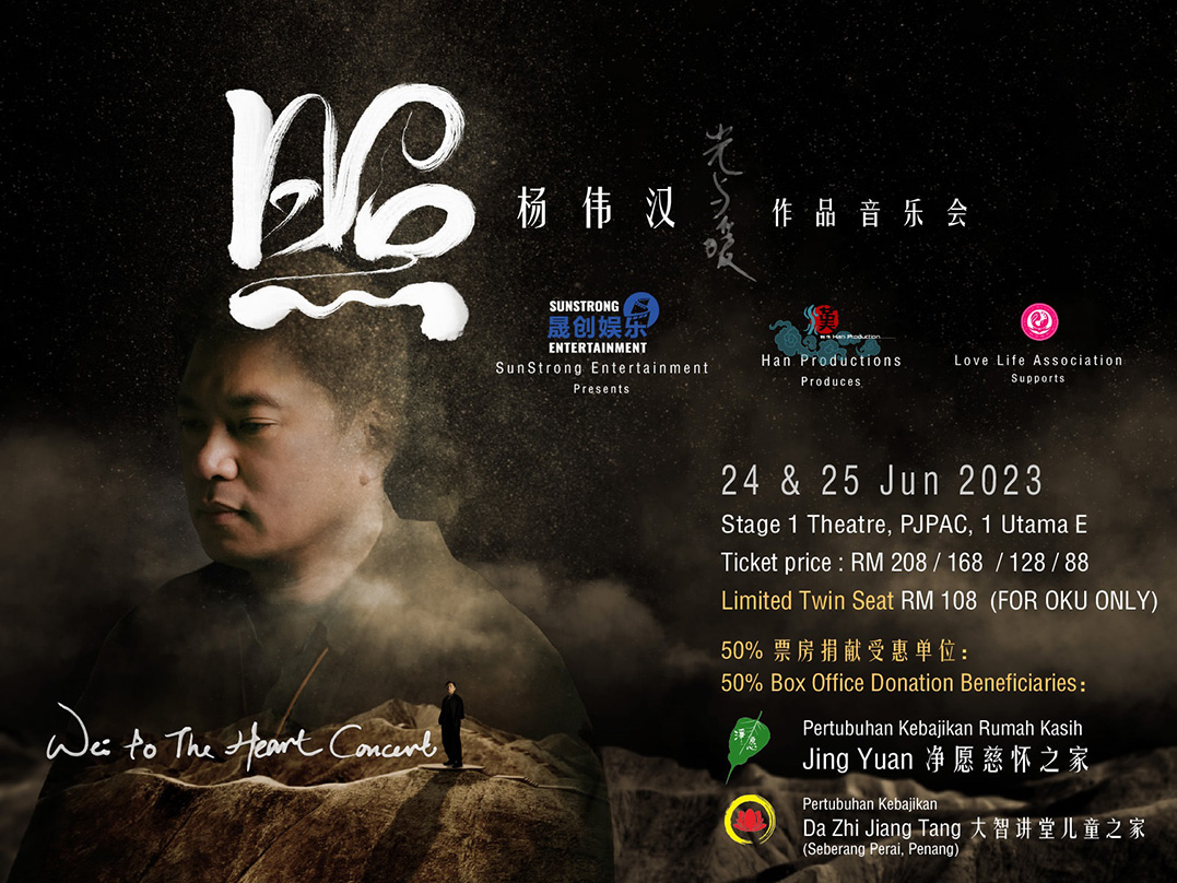 杨伟汉一直秉持 「多行善事,多种善恩」,一直以来所制作的音乐剧都会积极与慈善公益链接,这次要非常感谢SunStrong Entertainment 晟创娱乐的支持及赞助,Love Life Association圆爱组织全力支持,《照》杨伟汉作品音乐会除了能如期开办,也能做公益推动,50%票房收入捐献受惠单位净愿慈怀之家及大智讲堂儿童之家。大智讲堂儿童之家由释上宽法师创办,本着慈悲心、爱心和善心的传递精神,为孤儿和单亲儿童提供全面的照顾和关怀。净愿慈怀之家是非盈利团体,收容无依无靠的中风患者,以及免费照顾癌症末期病患及临终的病人,让他们有尊严的走完人生,让生命得到善终。