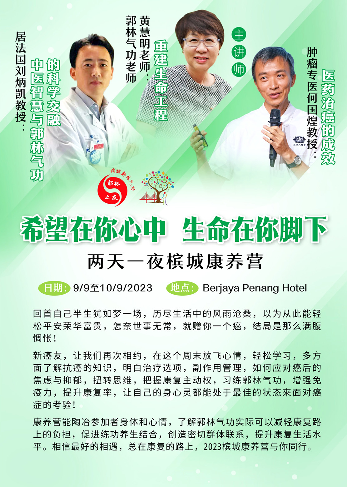 主办“希望在你心中 生命在你脚下” 两天一夜槟城康养营,主讲师为肿瘤专医何国煌教授、居法国刘炳凯教授以及郭林气功黄慧明老师。
