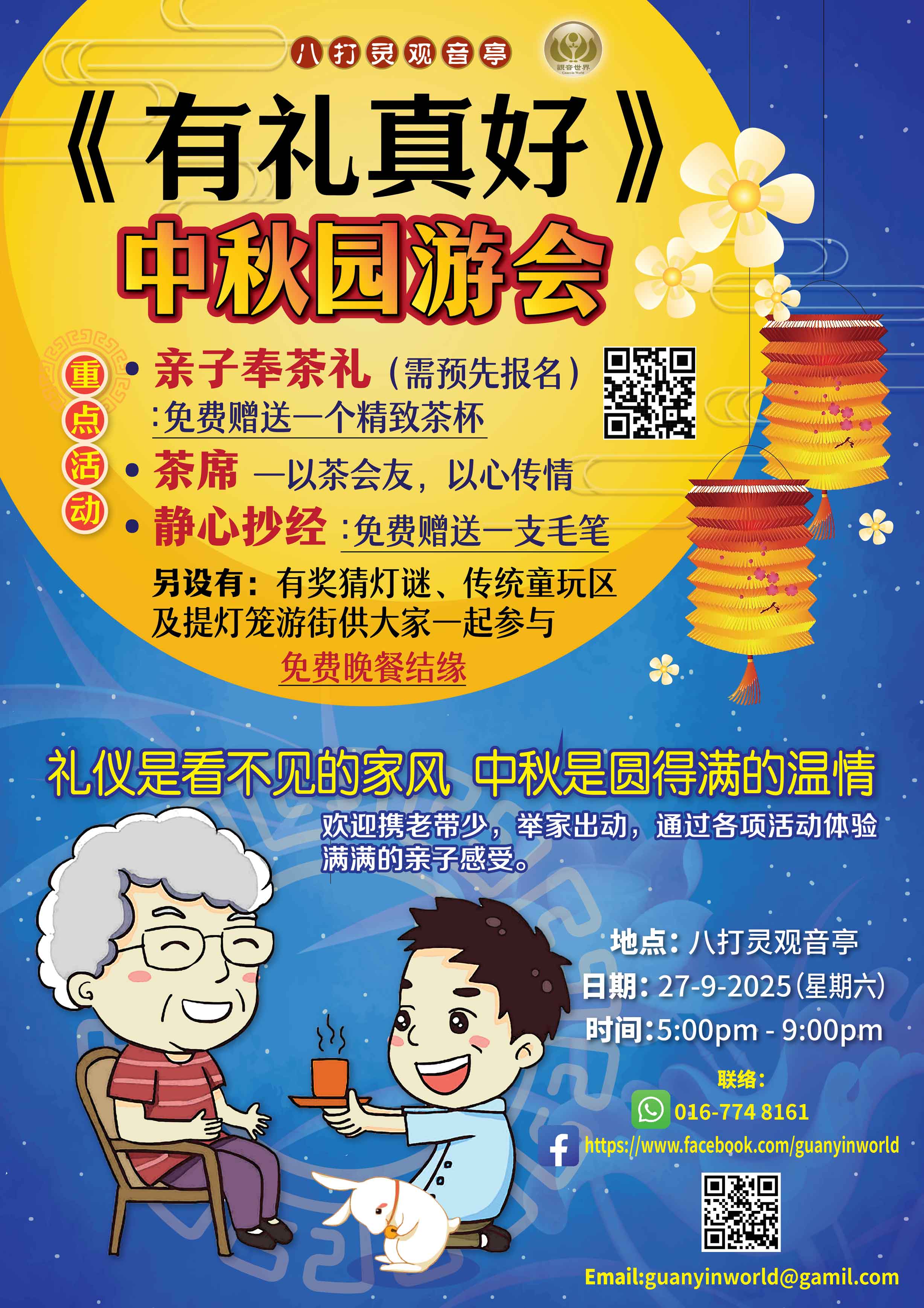 有感于中秋“团圆文化”所蕴含的情感凝聚力,决定于9月27日(星期六)在八打灵观音亭举办《有礼真好》中秋园游会,以“月”为媒介、以“礼”为根脉、以“家”为基石,通过“亲 子奉茶礼”、中秋茶席、抄写心经、传统童玩、趣猜灯谜、解暑小摊、观音文化、茶艺体验、提灯笼游街等活动,将明吉法师倡导的“急救礼仪”、“急救孝悌”理念转化为代代相传的生活智慧。