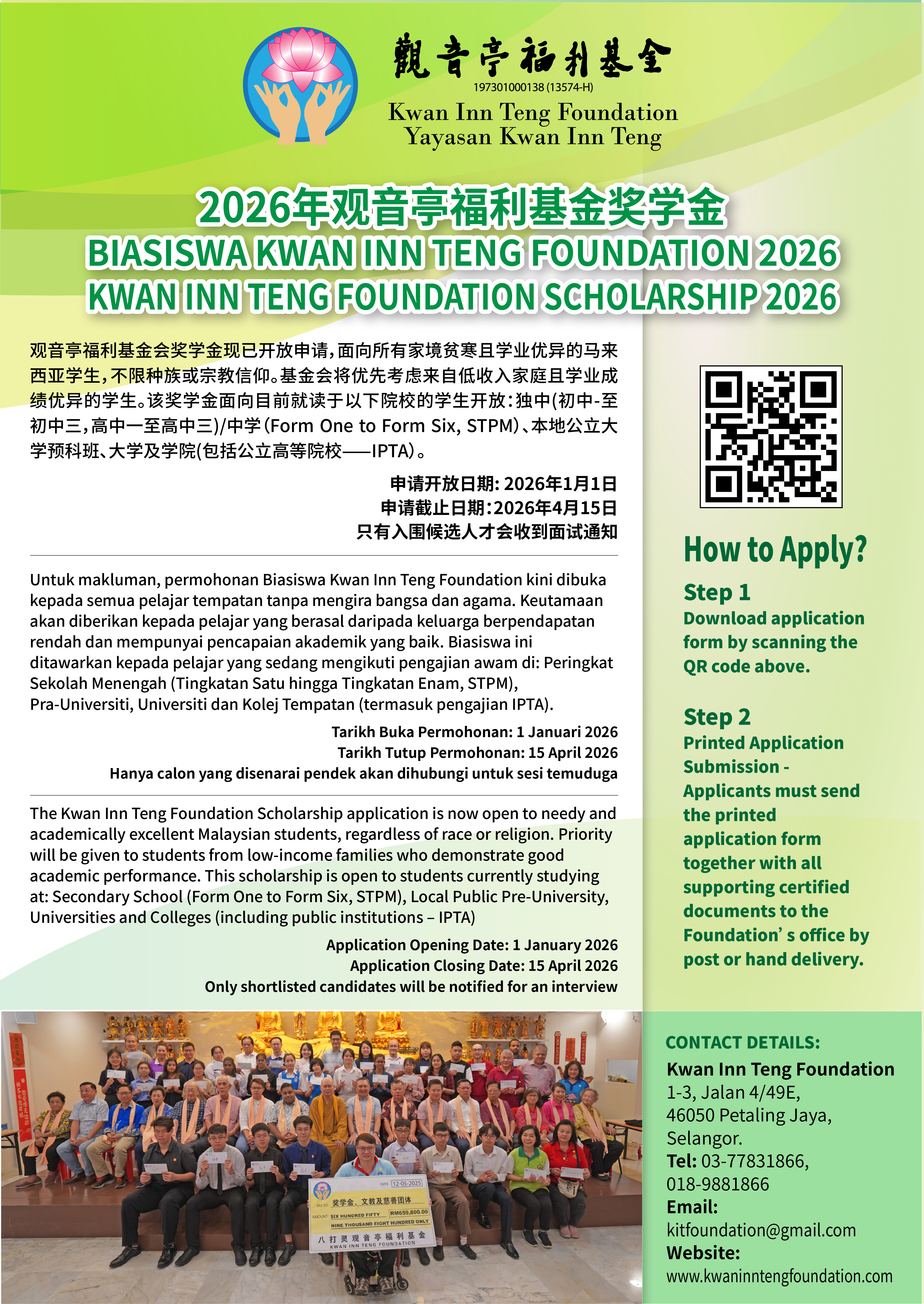 八打灵观音亭福利基金2026年奖学金定于1月1日开始接受申请,凡就读于各中学、独中,中六,大学先修班及本地非营利大学、学院之家境清寒,品学兼优的马来西亚公民皆可申请,截止日期是4月15日。