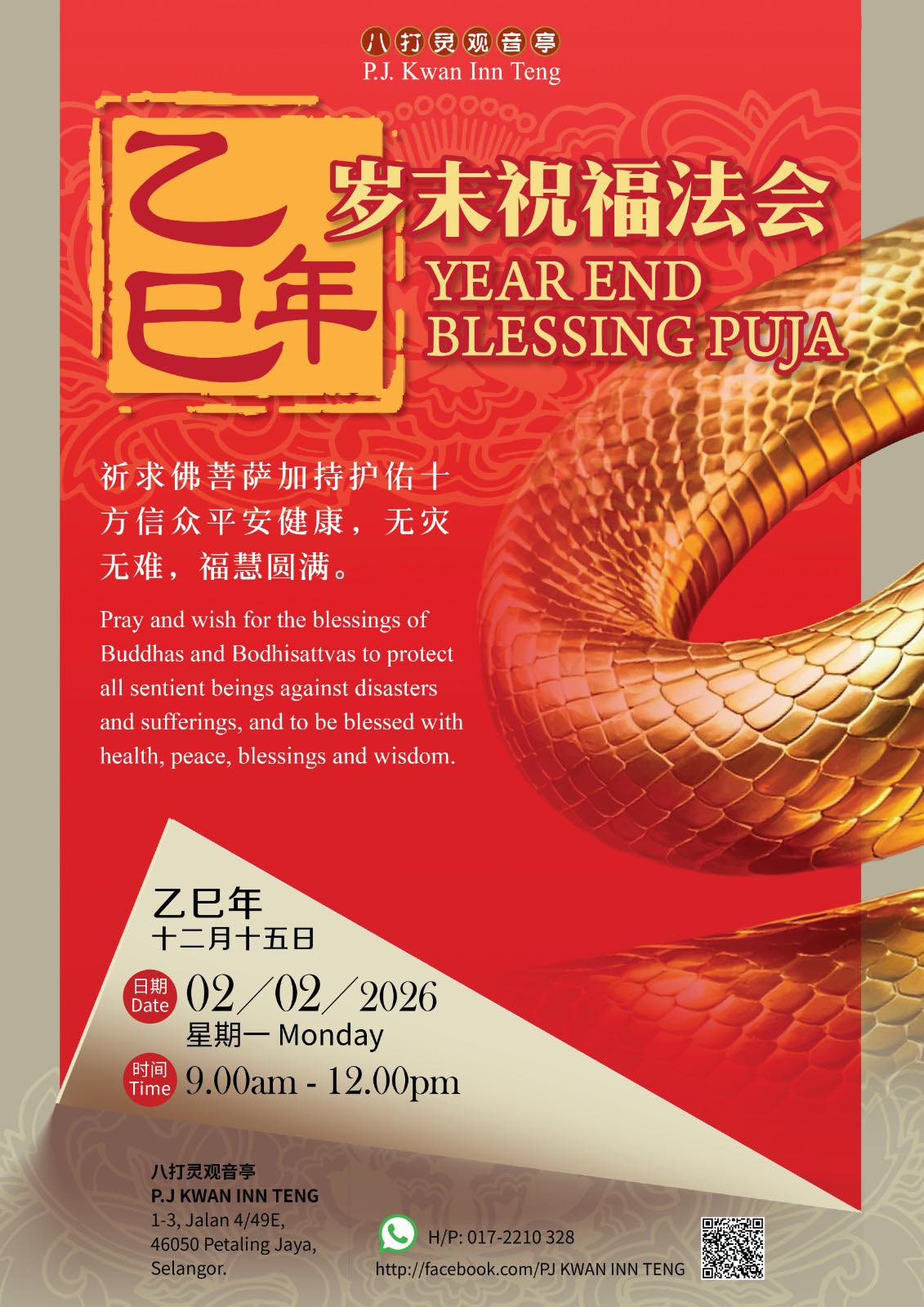 金蛇辞岁,赤马迎新!八打灵观音亭于2026年2月2日(星期一)乙巳年十二月十五日,上午9时至12时举办【乙巳年岁末祝福法会】,感恩诸佛菩萨龙天护法全年加持护佑,十方信众平安健康,无灾无难,诸事吉祥,福慧圆满。