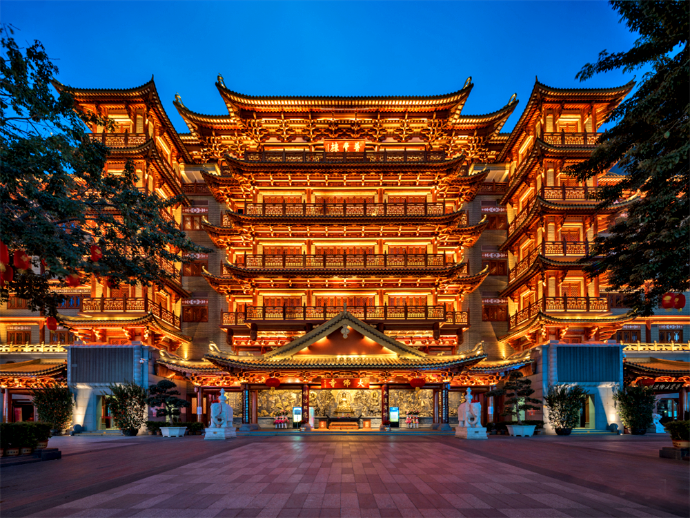 如今复建的大佛寺大隐隐于市,漫步大佛寺,听梵音绕梁,明亮的灯光照亮了整个寺庙,看屋檐上充满年代味道韵调,总让人想去听一听关于它那个年代久远的故事。