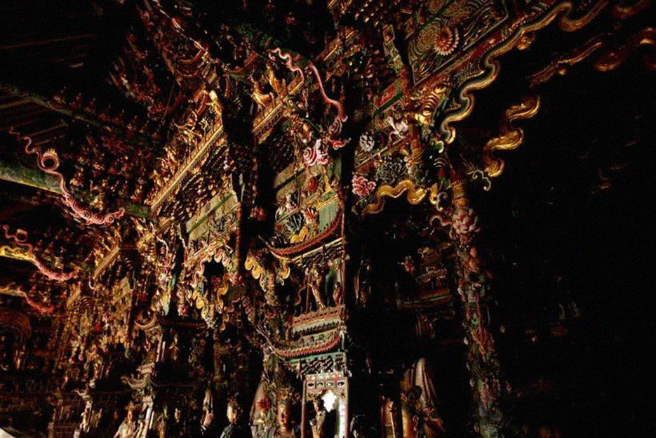 大梁上,八大金刚威武雄壮,梁间墙壁上悬塑着富丽堂皇的“极乐世界”;众多的人面飞天、神鸟、孔雀、鹦鹉、仙鹤游弋在飘渺的云头上,十二乐伎菩萨身姿轻盈,温柔高洁,往来自如地表演着“天界”歌舞。整个殿内,天宫楼阁,层层叠叠,云雾缭绕,粉彩妆銮,呈现出一派仙宫佛国的迷人景象。
