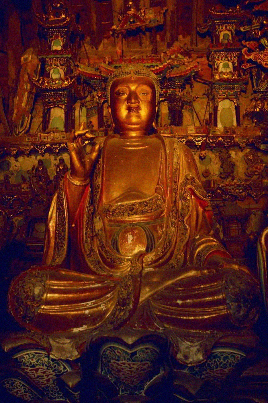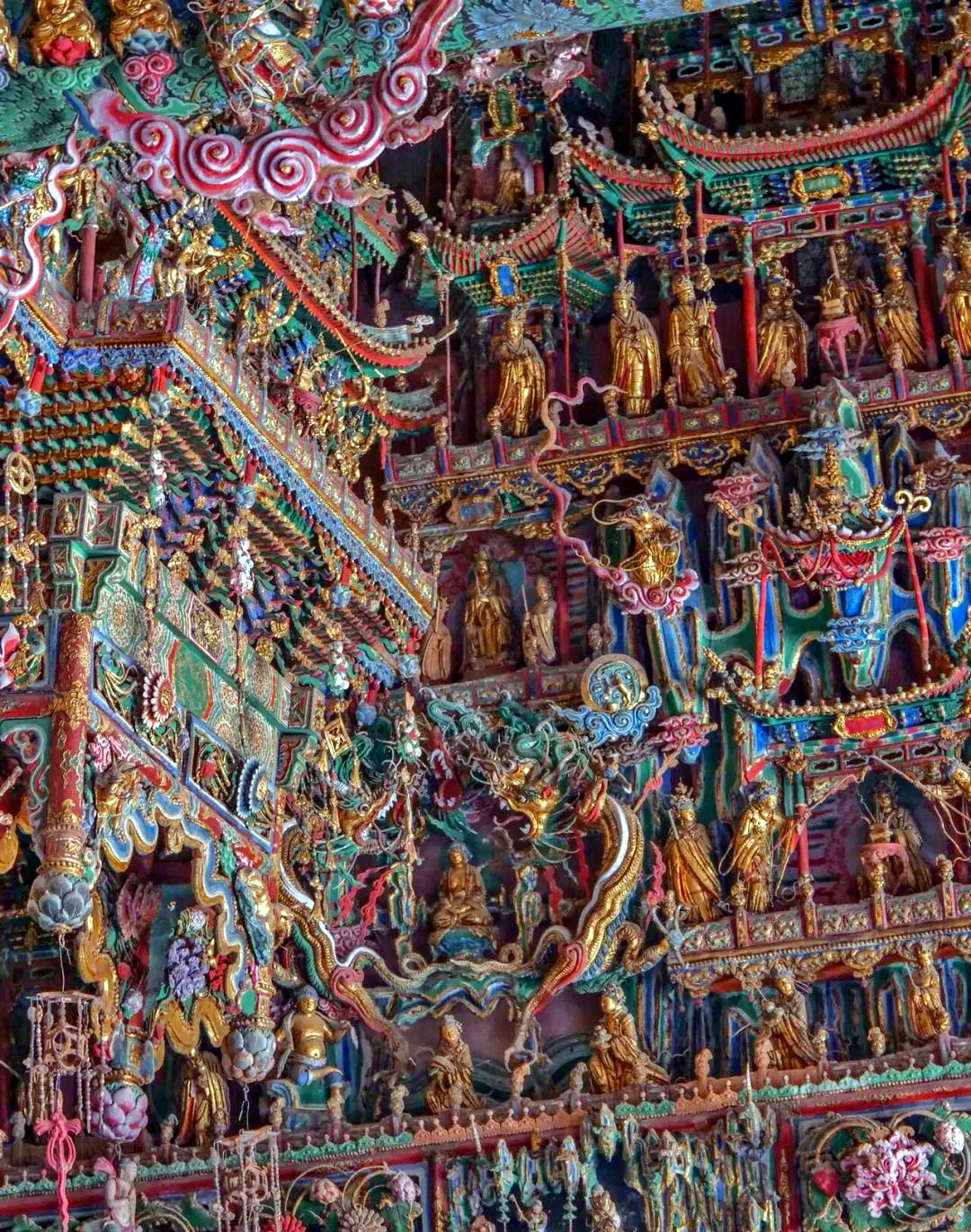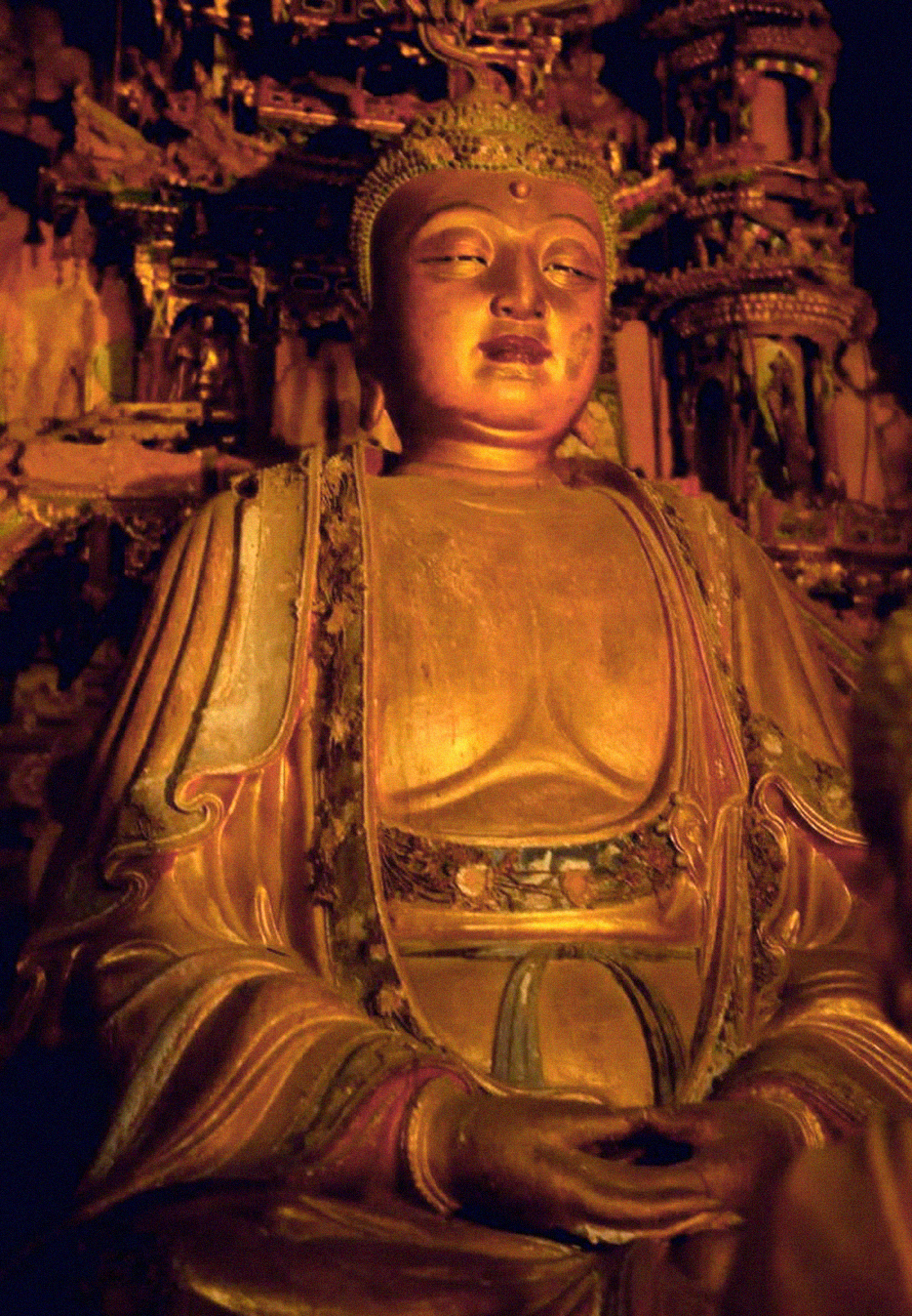 上院则是小西天的精华所在,大雄宝殿内的明代泥塑举世闻名,满殿泥塑的殿堂楼阁、神楼佛龛、奇花异木、珍禽走兽、菩萨神灵、飞天乐伎,令人目不暇接,置身其中,仿佛进入了一个神奇的仙宫佛国极乐世界,让人流连忘返。