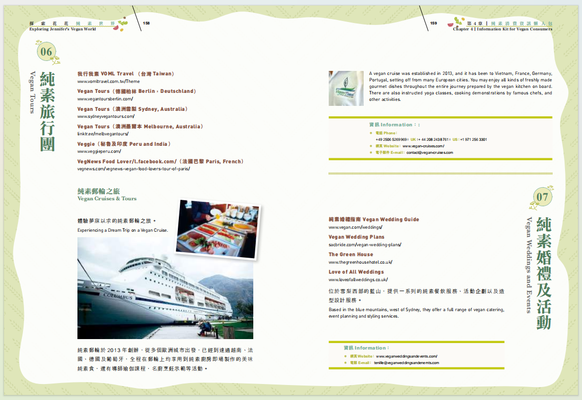 这本书是我在澳大利亚(编者注:花花的家人也在澳大利亚)时,一边工作,一边完成。里面有关于我的素食经历和遇到的事情;有我去不同国家国家地区吃到比较有特色的素食餐厅分享;还有一些无蛋无奶的甜品食谱和环保、素食营养资讯等内容。