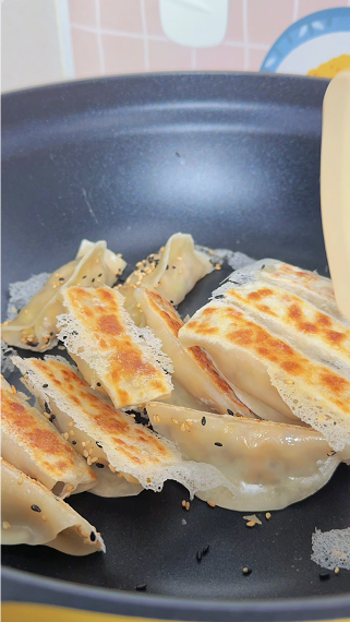 第二步,取饺子皮,放适量馅料,对折捏合中间,两端留口(经典锅贴形状),平底锅热锅刷薄油,将锅贴整齐码入,等底部变色后倒入半碗淀粉水,盖上锅盖,转中大火焖煮,至水分基本收干,撒上芝麻就可以出锅了,加入卷心菜后,馅料口感更丰富、层次更多,且能增加清甜和爽脆度~