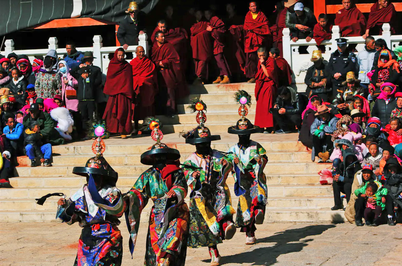 每年藏历冬月26日和29日,当地藏民来到松赞林寺,看喇嘛们带着面具跳神,庆贺当年丰收昌顺,祈求来年太平昌盛。