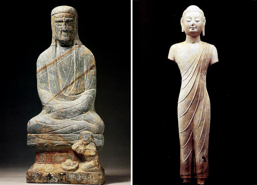 青州佛教造像不仅出土数量多、保存好,而且很多造像上保留有彩绘和贴金,彩绘的颜色有朱砂、宝蓝、赭石、孔雀绿、黑、白颜料,贴金部分主要为佛像皮肤裸露部分,十分珍贵。青州佛教造像绝大多数都是用当地盛产的称为青石的石灰石雕刻而成,同为石质造像,但其中反映的时代风格尤其是北魏至北齐时期非常鲜明,北魏晚期到东魏造像大多身材单薄、面部颧骨微微突出,称为秀骨清像,深受其时汉族士大夫阶层传统审美情趣的影响,同时还延续着西域风格的造像特征;北齐时期,早期从印度传入的艺术风格再次成为主流。单体佛像采用凸棱的方式刻出衣纹,好像打湿的衣衫紧贴身体,充分显现着人体线条的优美,称为“曹衣出水”样式。单体菩萨造像则表现出细腻华丽的风格,佩戴华美饰物的菩萨像都经过彩绘和贴金处理,光彩照人。背屏式佛三尊造像除注意佛与菩萨形象的塑造,同时对莲台的装饰性处理极富情趣,从佛的莲台两侧各伸出一朵长茎仰莲,成为二胁侍菩萨的台座,最具代表性的则是在佛的身体下部两侧各刻一飞舞的龙,从龙的嘴里分别向左右两侧吐出一朵带荷叶的莲花,形成二胁侍菩萨的台座,既具有装饰意味,又极具艺术表现力,同时又巧妙地符合了佛经中的记载,使中国化的神话动物——龙,成为佛教艺术中的护法形象。