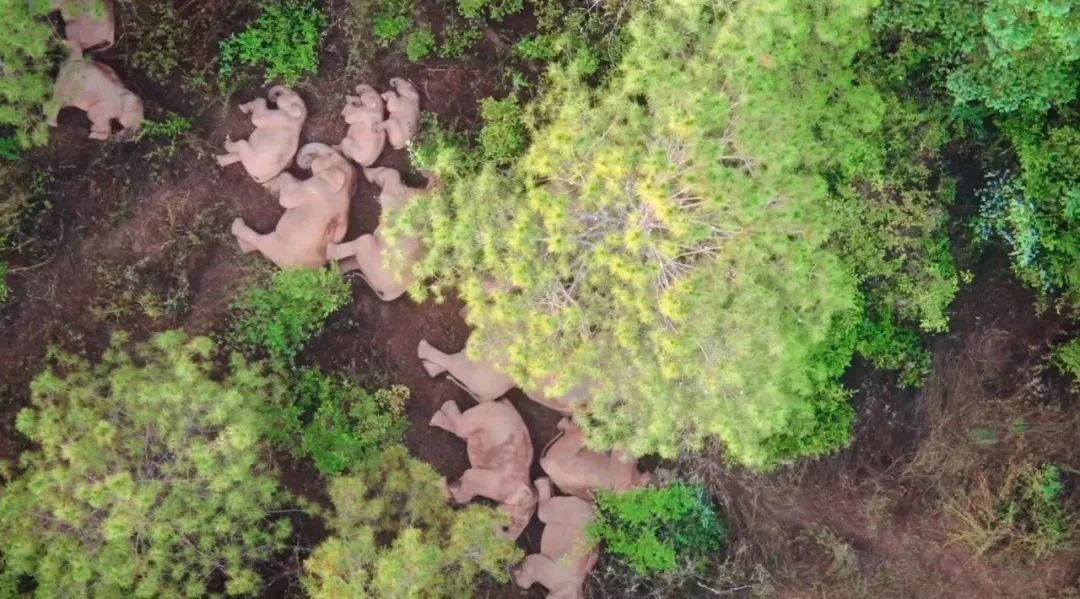 ▲ 长途跋涉后,大象集体在树林里躺睡