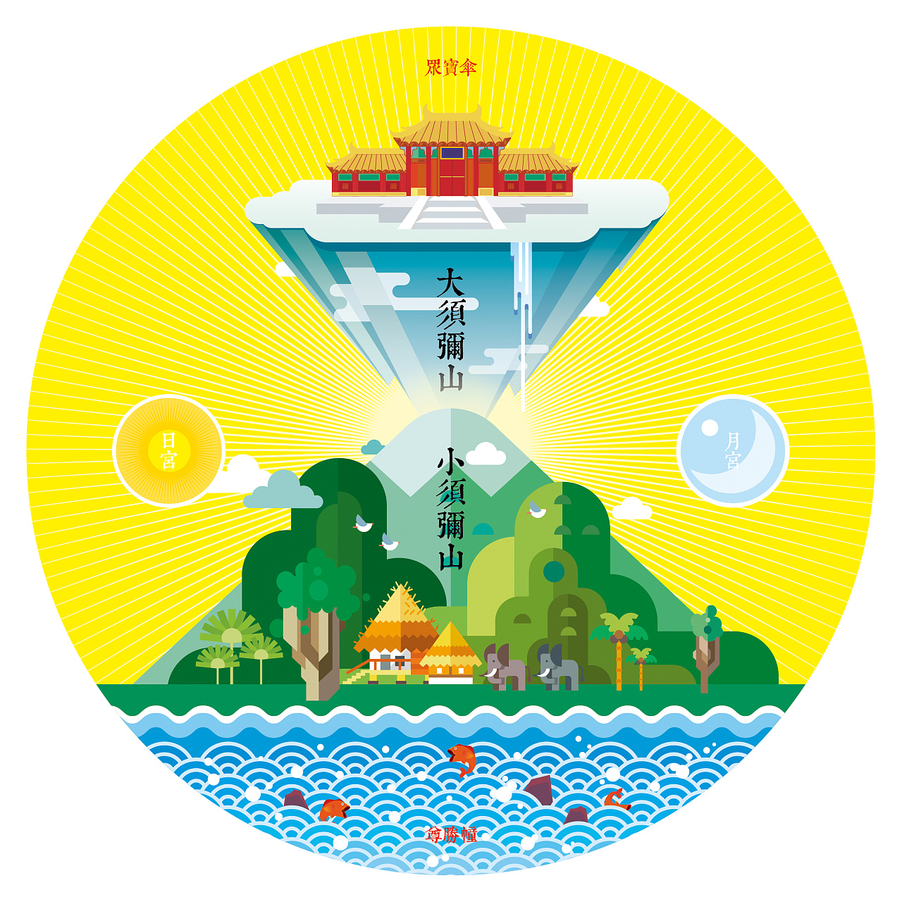 须弥山,又作苏迷卢山、须弥卢山、须弥留山、修迷楼山,略作弥楼山。意译作:妙高山、好光山、好高山、善高山、善积山、妙光山、安明由山。原为印度神话中之山名,佛教之宇宙观沿用之,谓其为耸立于一小世界中央之高山。一日月绕一须弥山,以此山为中心,周围有八山、八海环绕,而形成一世界(须弥世界)。