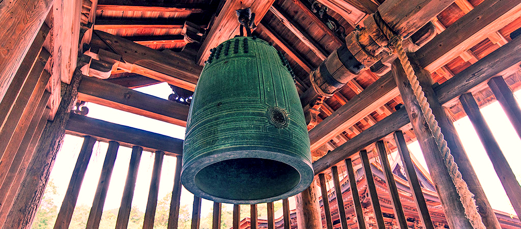 寺院里的钟有两种,一种是唤钟,吊在佛堂的角落里,用来通知召集寺内的僧人用,另一种是梵钟,这种钟体型比较大,吊在寺院的钟楼上,每天早晚撞击两次,早上撞击是通知寺里的僧人做早课,晚上是在熄灯时撞击。