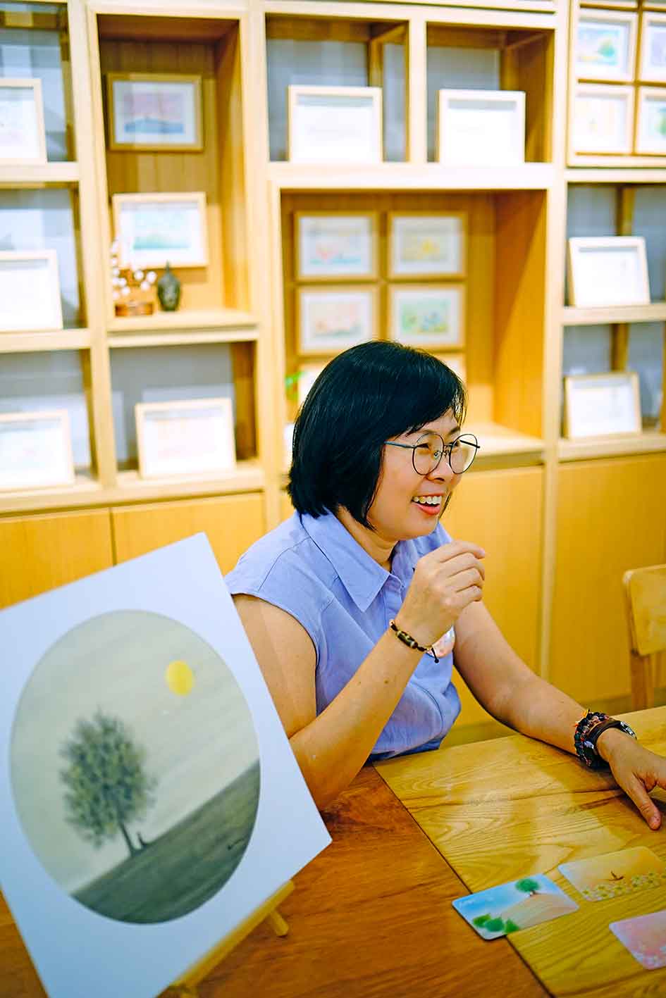 “打从新冠疫情行动管制期间,他就跟我学画画。他现在应该也有七十八岁了。我很感动一位长者,还是男人,会热爱粉彩画。他一幅又一幅临摹我的作品来画。”