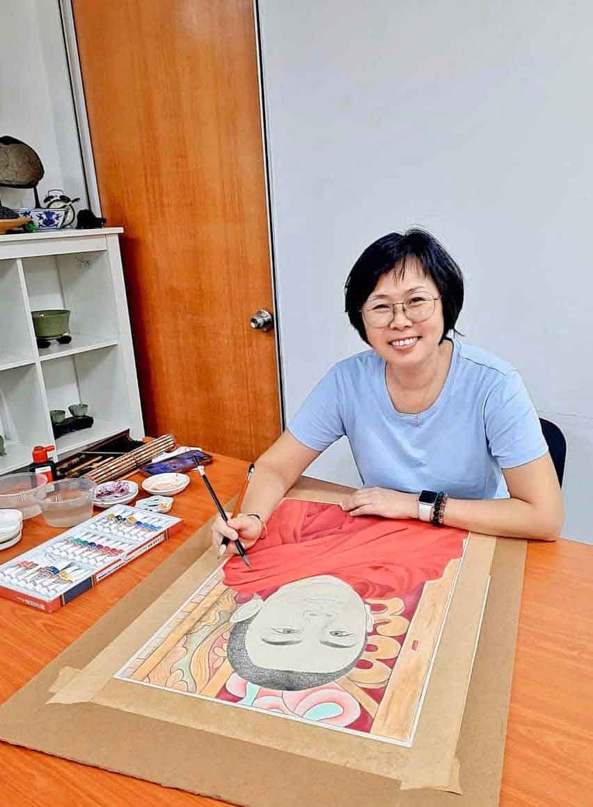 眼前的她, 不再背负过重的哀愁, 她懂得通过绘画和色彩表达她的情感, 用佛法的光明照见心底涌现的阴暗。