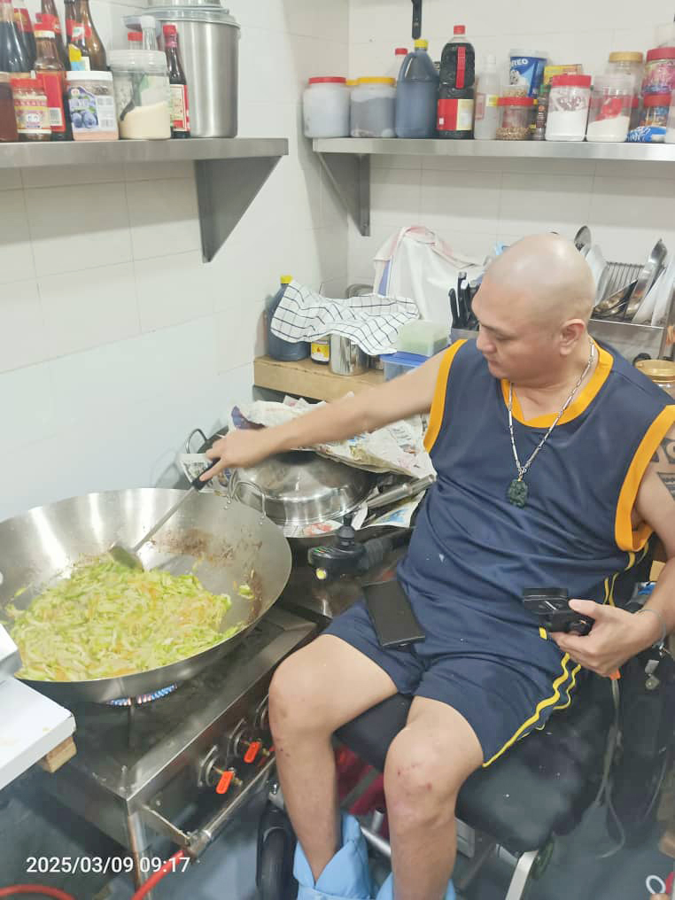 一走进Marcus的家,便直奔他的厨房,只见坐在轮椅上的他,早已备妥所有NasiLemak的配料。他家的厨房经过特别改装,符合轮椅操作的需求,由他亲自设计调整炉灶的高度,确保自己在轮椅上也能顺利完成每道工序。从备料、洗切、调味、翻炒到装饭,他一丝不苟,每一份便当都蕴含满满的慈爱。