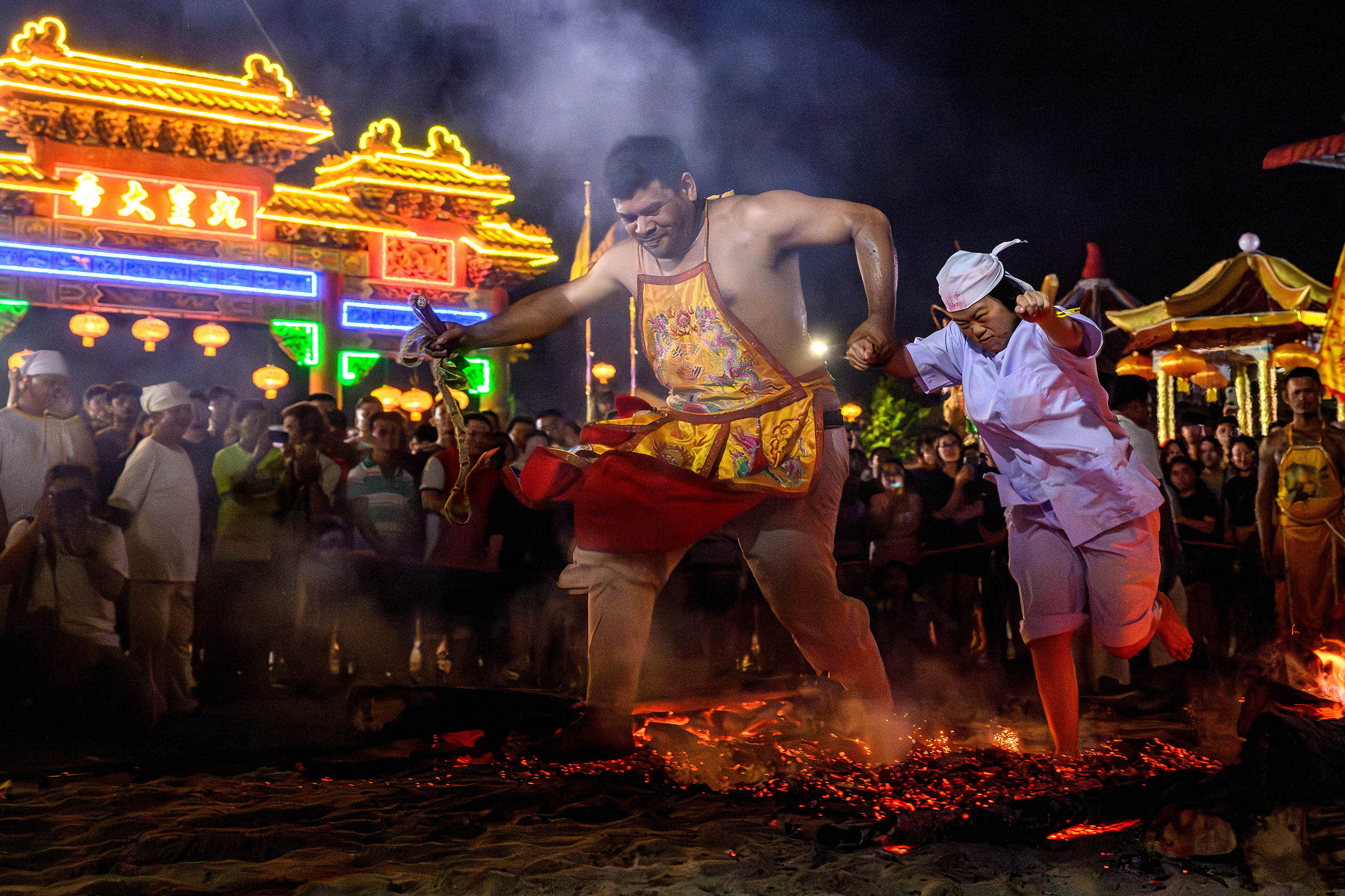 我为此像个追星狂粉,一连几晚冒着替九皇爷洗涤尘垢的骤雨,流连各处宫庙举办的形色炼火仪式,古人以此举驱瘟治病,在我看来却是一种信仰拷问,答案可从一场踩橡木过火活动,信众脸上耐人寻味的表情包里逐一拆解。当烈焰将橡木熬成红碳,乩童率先表演特技,时而腾跨乱窜如九头蛇的火苗,再来一个灵猴翻滚流星飞火,旁观者已是惊呆如泥塑,轮到凡人排队上阵时,淡定哥合掌默念祝祷,波澜不惊漫步而过;换个双手拎摆裙角的斯文女,踮起脚尖踢踏如即兴来一段佛朗明哥舞;还有惊恐大叔,一个踉跄竟扑倒在我镜头前;接着是不知所措小妹,举步艰难的模样,获赤膊乩童出手搭救,轻松带飞。如果勇敢独行是因为信仰赐予力量,那么相扶相持更散发出互信的超然。