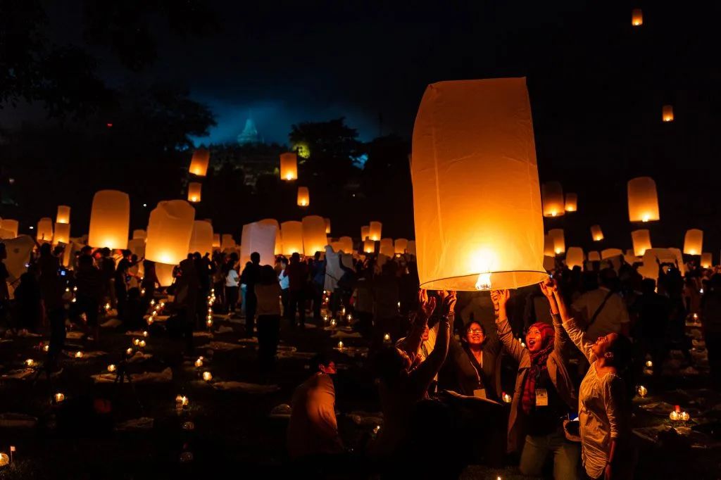 在印尼,卫塞节中最神圣、最盛大的活动在中爪哇的婆罗浮屠寺(Borobudur Temple)举行,这里是佛教朝圣的中心,是世界上最大的古老佛教寺庙,是联合国教科文组织世界遗产。在节日期间,僧侣和信徒从世界各地赶来,祈祷、冥想;夜幕降临,将数千只天灯放飞至婆罗浮屠寺上空,场面非常震撼!