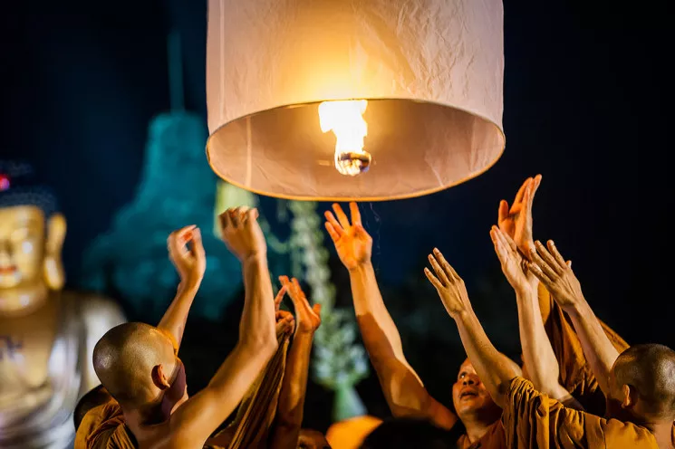绕寺三圈之后,临近卫塞节的最后一秒,所有信徒都将进行深度冥想,接受比丘的加持。然后,人们开始放飞卫塞节天灯。