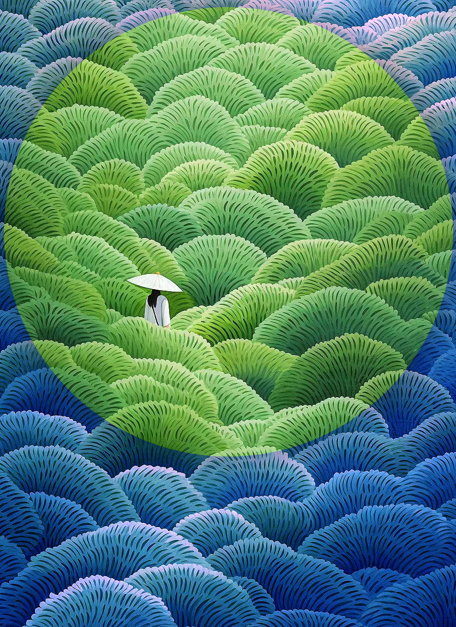 我回忆当时作画的过程,那名小女孩是最后画上去的。当时在想着画中的湖泊要画什么呢?突然灵机一动,我便画了一名小女孩站在湖泊中,欣赏着眼前有如一轮明月的曼陀罗。记得当时也有人建议我画多一个人陪伴在小女孩身边,我想了想,直觉她就是一个人,享受着眼前的美景,以及孤独静默的时刻。她其实是在享受孤独。
