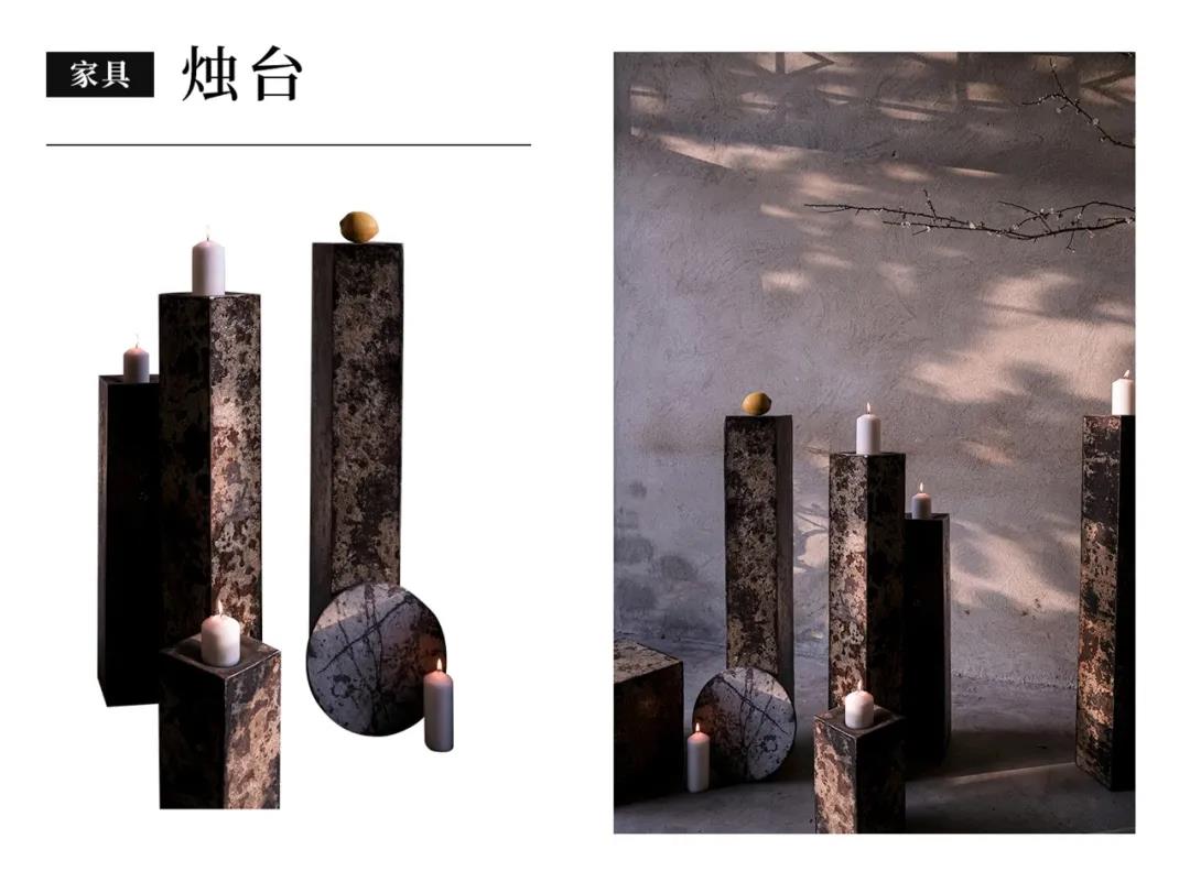 如果它肌理整块都比较好,我就会把它保留下来,做成一幅画,像折纸一样,给它再折出一些乱乱的纹,就很抽象的图案。如果它肌理不好,就切割做一些别的东西,比如茶席,柜子,烛台什么的。比如说榻榻米上那个吊灯,就是用残破的废铁来做的。