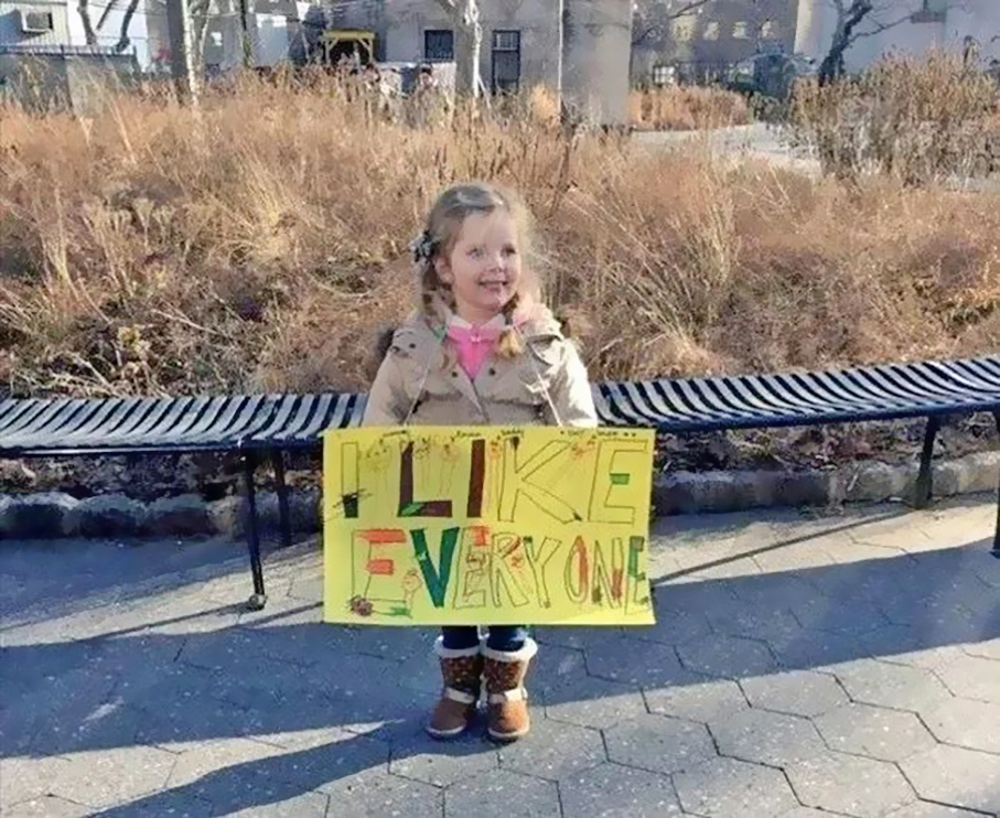 ◆ 国外的小女孩一整天站在街头举着一个牌子,这个牌子上写着我喜欢每一个人,当路过小女孩的行人看到这句话,一定会感到非常的欣慰吧!
