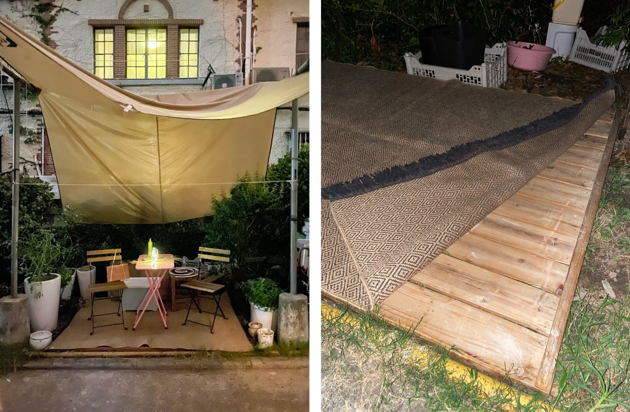 ▲ 依靠捡来的宝,波妞和室友拥有了户外小花园,地垫是由捡来的床板改造而成,床板的搬运破费周折,也让波妞感受到了上海温暖可爱的一面