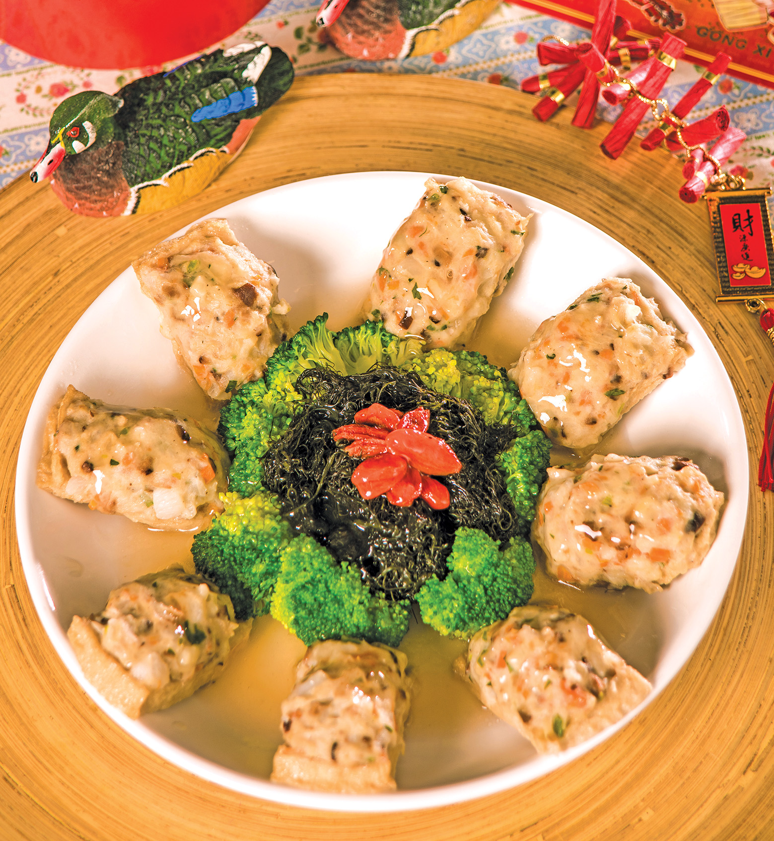 5. 将每一份日本豆腐抹上少许生粉(木薯粉),釀入适量馅料,以大火蒸8分钟。取出排上(E)装饰,煮滚(F)芡汁浇上即成。