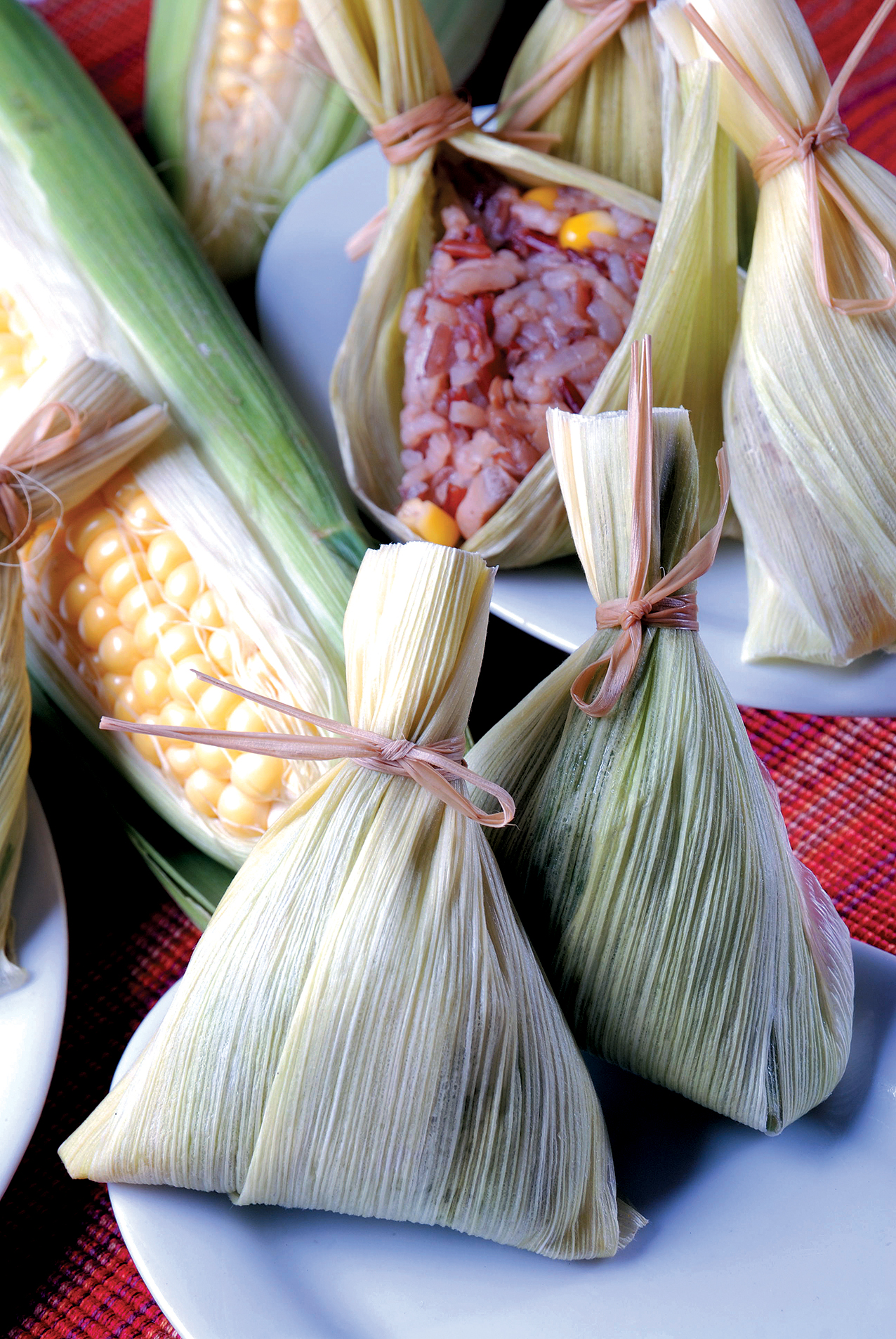 3. 用2-3片玉米衣,铺平,中间放入适量的饭包好,用水草扎口。将全部米饭扎好后,蒸5分钟即可享用。