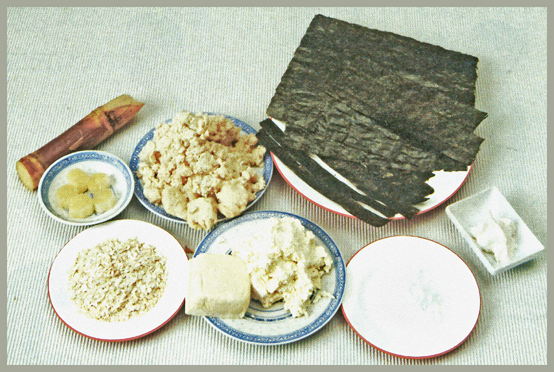 1. 料(1)用搅拌机搅烂加入(2)料拌匀,分出4等份,做出4块素鱼,中间放入甘蔗。鱼块边围紫菜条。