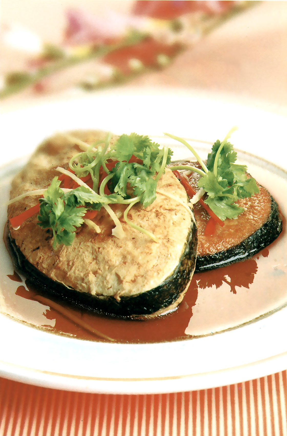 2.摆上芫荽丝、姜丝、红辣椒丝装饰,乘热享用。