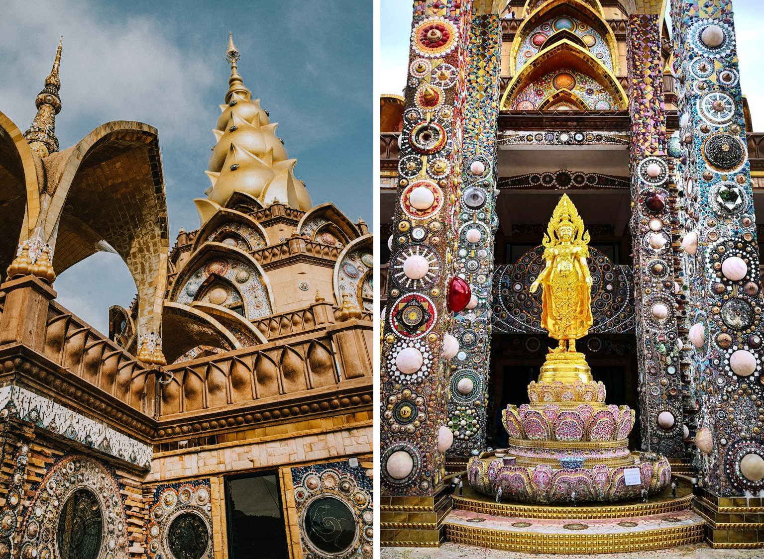 寺庙整体看起来像一座小宫殿,从山上俯瞰,山景有点像瑞士。主塔和周围建筑装饰着500多万件彩色马赛克瓷砖和陶器,造型十分精美,颇有西班牙的高迪味。