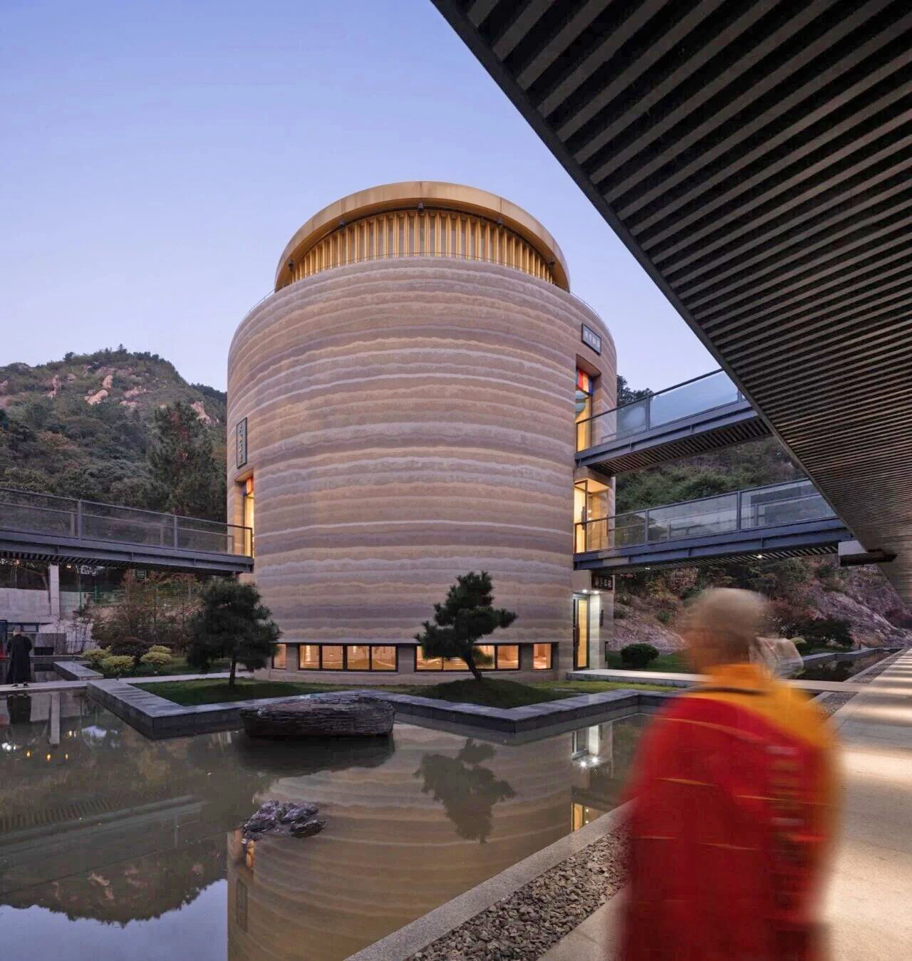 于是,在禅寺的中心,一座圆柱形建筑拔地而起,成为整个寺庙的灵魂,牢牢占据了视觉C位。它像一座垂直耸立的“灯塔”,所有功能空间都围绕它放射性展开。