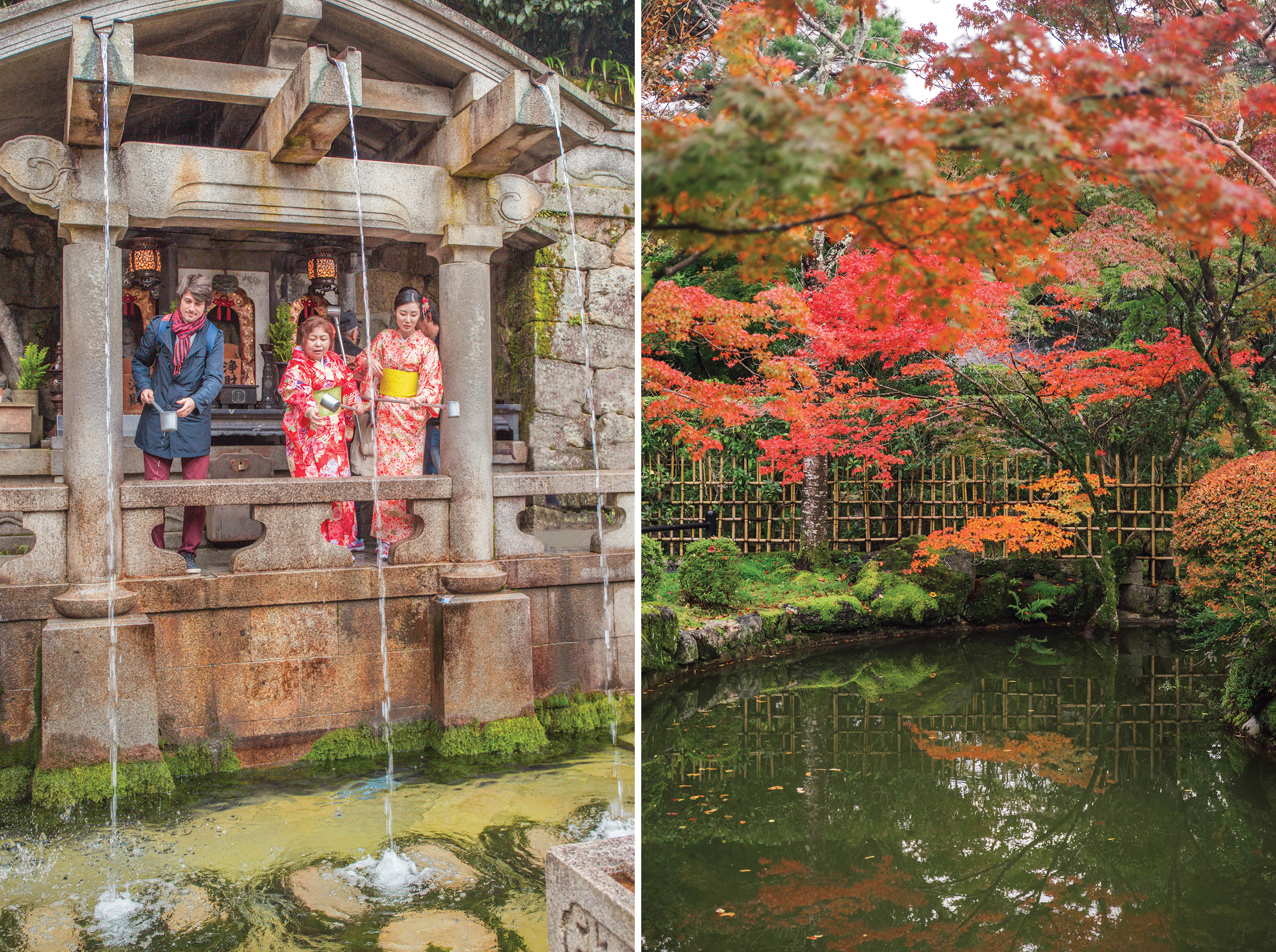 顺着奥院的石阶而下便是音羽瀑布,清泉一分为三,分别代表长寿、健康、智慧,游客路经此地必定会来喝上一口水,据说可预防疾病及灾厄。该清泉甚至被列为日本十大名泉之首,清水寺的寺名也是因此而来。