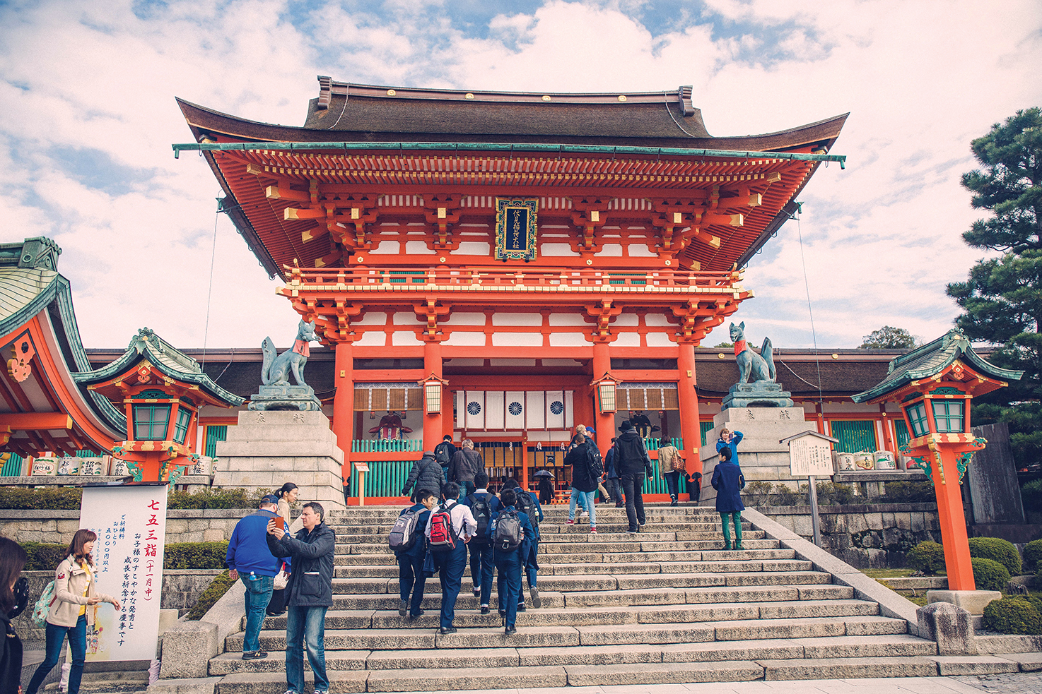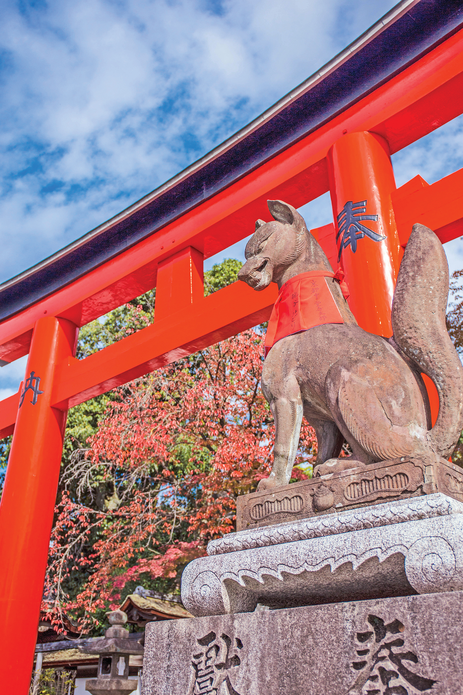 位于稻荷山山间的“伏见稻荷神社”已有千多年历史,是一座遍布日本全国3万余座稻荷神社的总社,同时也是京都最古老的神社之一。在这里,供奉的是保佑生意兴隆,五谷丰登的稻荷神。橘红庙宇鲜艳抢眼,入口两则皆竖立着狐狸雕像,狐狸在日本心中是介於人与神之间的使者,能够保佑五谷丰收及风调雨顺,所以可说是农民的守护神之一。