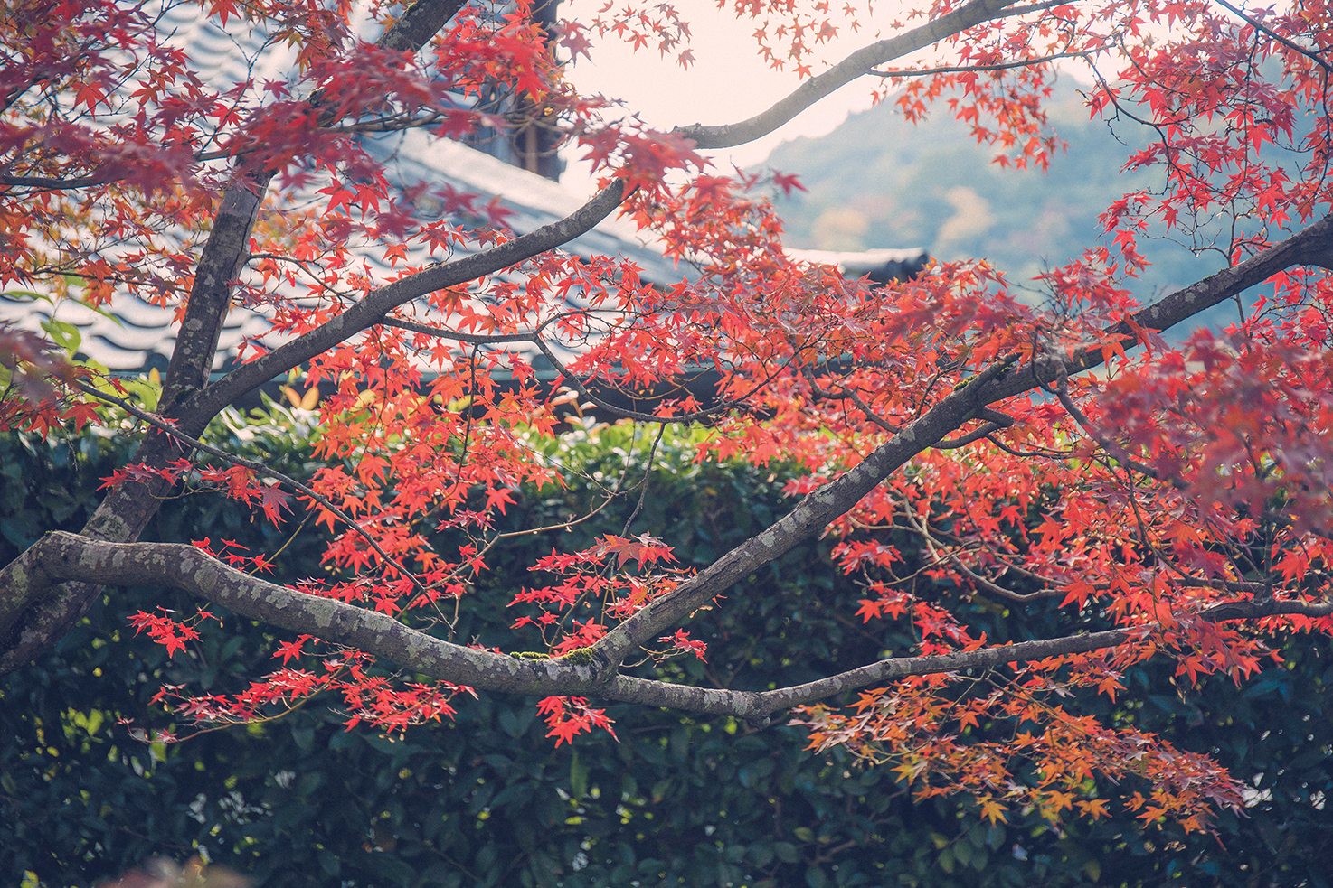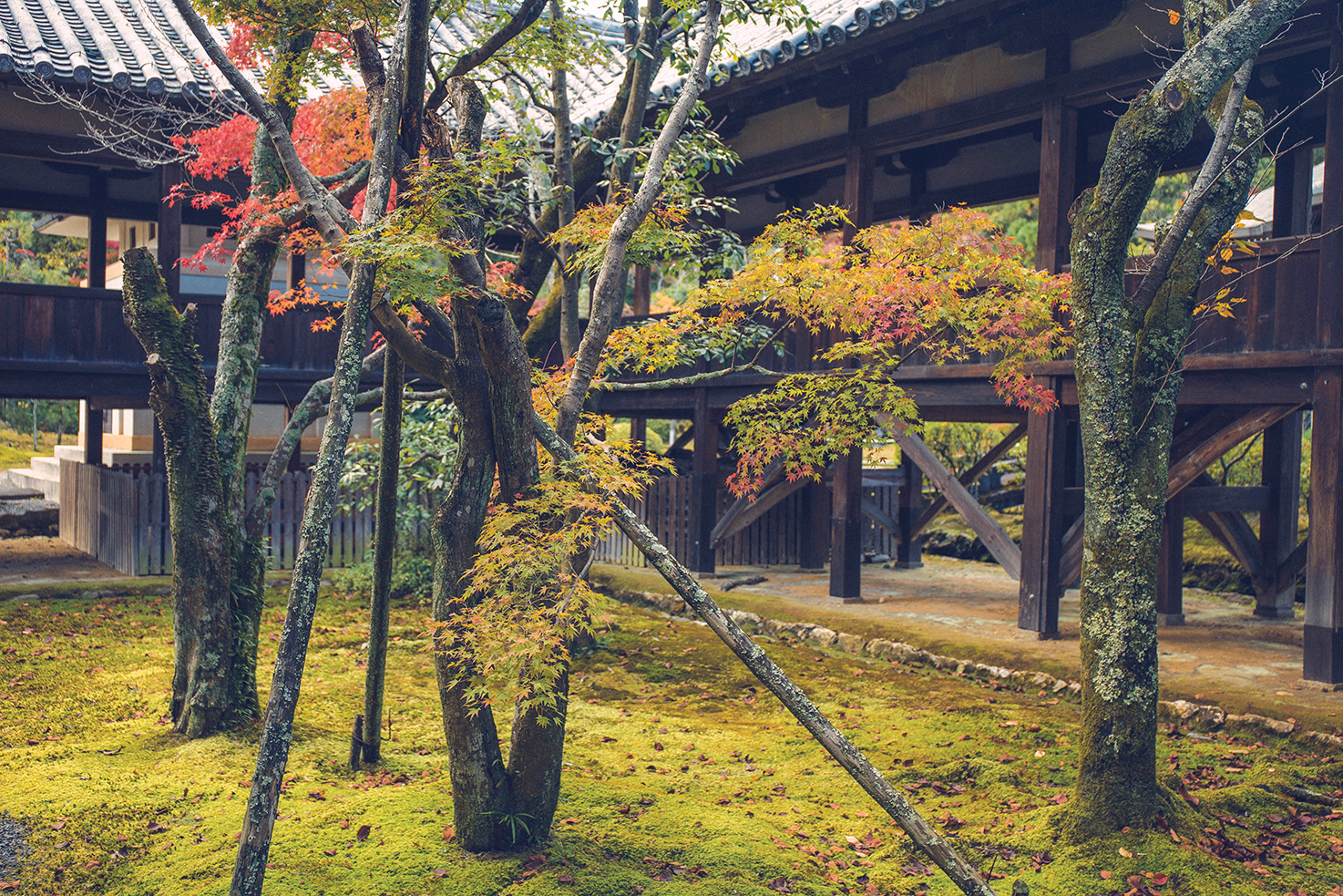 位于西北地区的岚山确实是赏枫圣地,即可远眺远方枫叶点缀的群山,更可坐在禅院的屋檐回廊下,细细感受庭院内精致的枫叶景观。