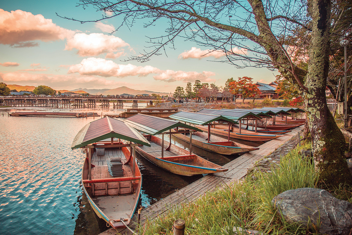 渡月桥是岚山的地标,别名岚桥,是承和年代的空海弟子道昌所建,而“渡月桥”这名字却是后来镰仓时代的龟山天皇一时兴起所取,他当时感叹的说:在无云的夜晚上,月亮看起来在在跨越全桥。