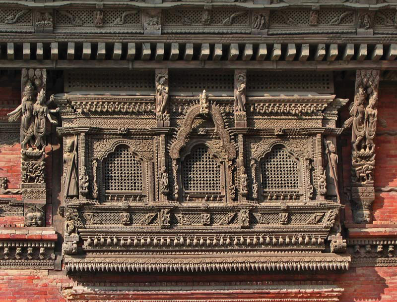 ◆ 铜铸兴都教神牌后面墙上的木窗型设计是藏式的,各样糅合,就是尼泊尔的加德满都。
