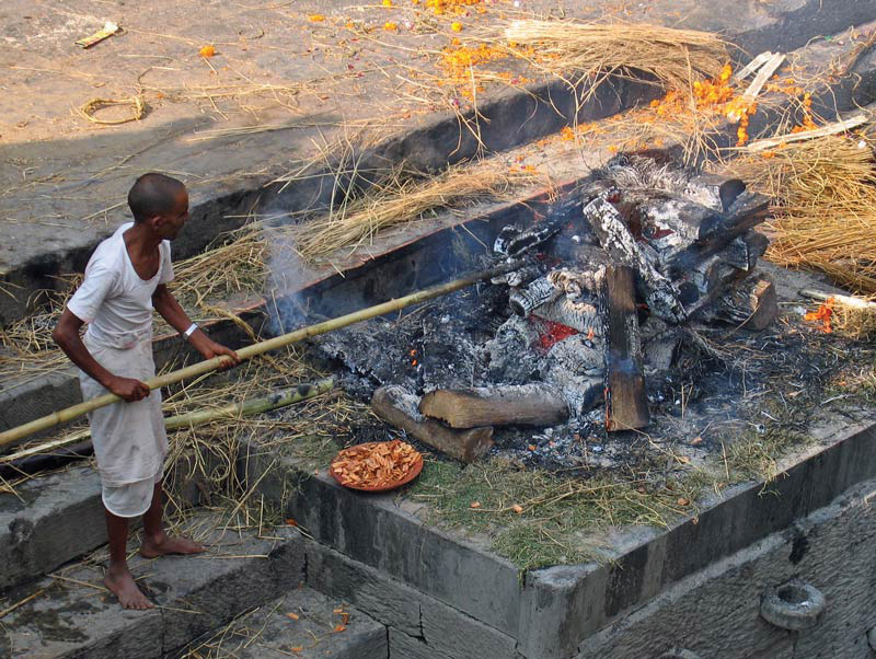 覆着万寿菊般黄色缠尸布的死者遗体,像披上最后一次的闪亮抬进来,搁在河边石级上,先让祭师念经一番,跟着就放到叠成单数的柴火上,点火焚烧。过程中,筋骨常会因受热而整具遗体突然坐起来。那么火葬师傅就会用一根大木柴把骨头敲碎,好让遗体留在火上,这熊熊大火大概也就一小时,之后皆成灰烬。撒入河里,河边偶尔还有小童,跑到河水浅处看看可有些还没烧坏的银币,拾到了,亦皆大欢喜。