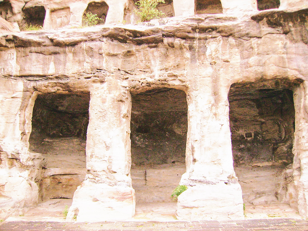 沿山体雕出的窟前列柱。