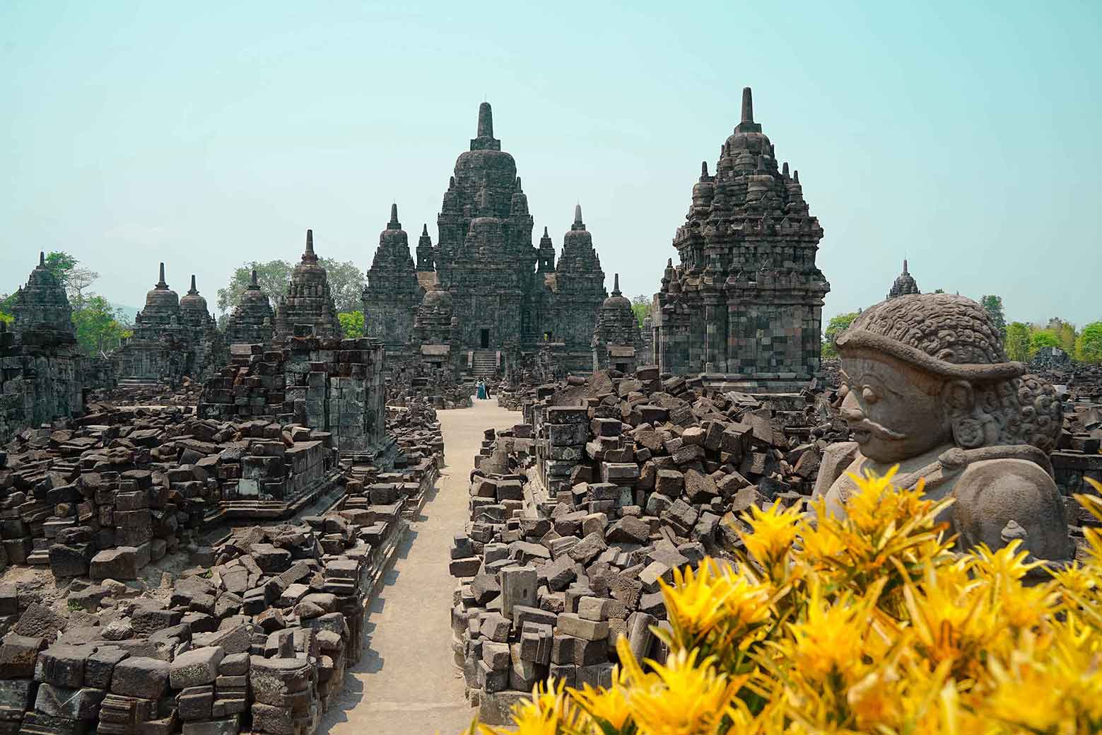 普兰班南建筑群乃印尼境内最大、最美丽的印度教庙宇,建于10世纪,由240座庙宇所组成,其中六座寺庙在广场中间巍峨耸立,分别供奉着三位主神——湿婆、毗湿奴和梵天及其坐骑,是印尼最大的湿婆神庙。