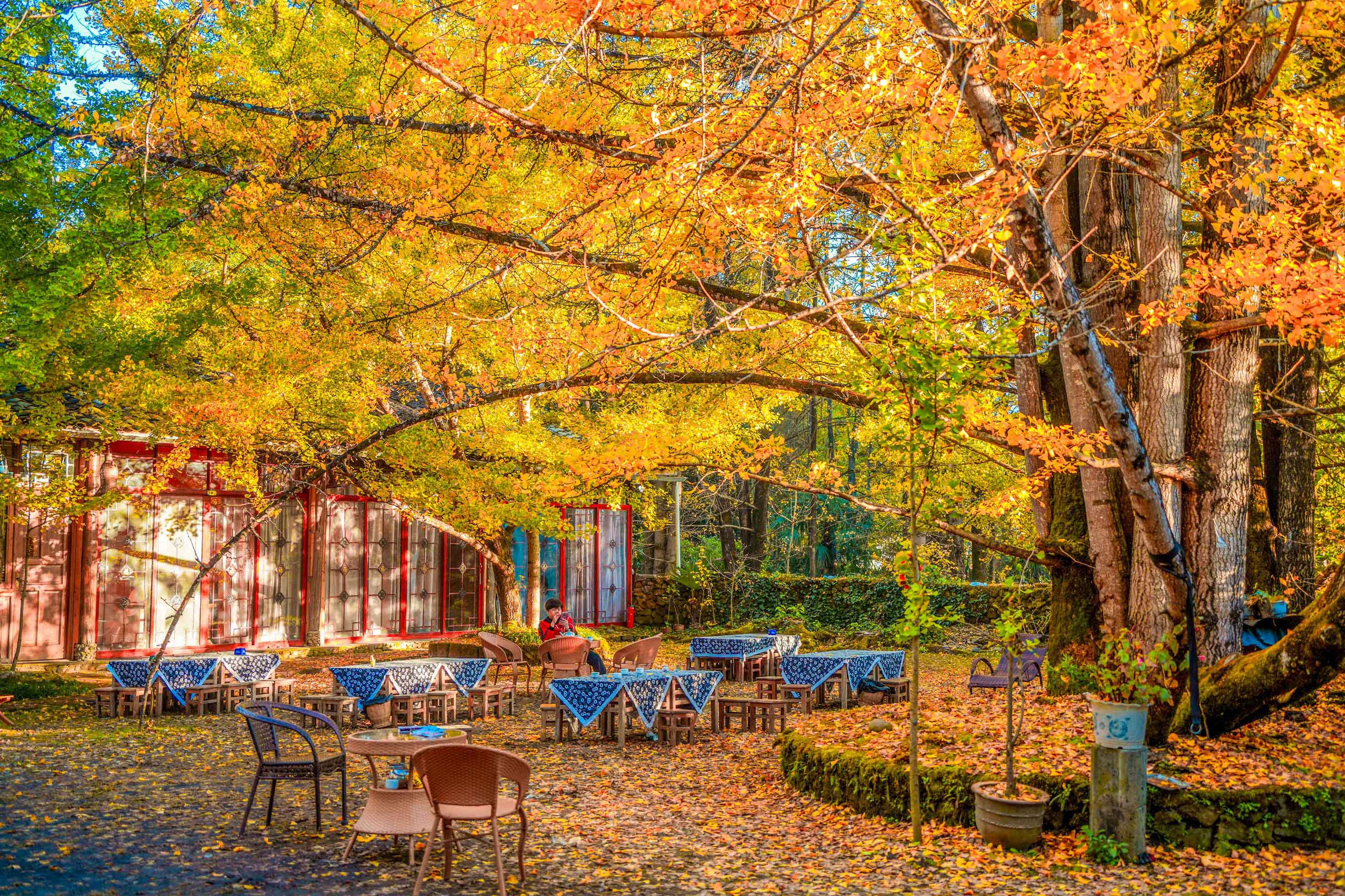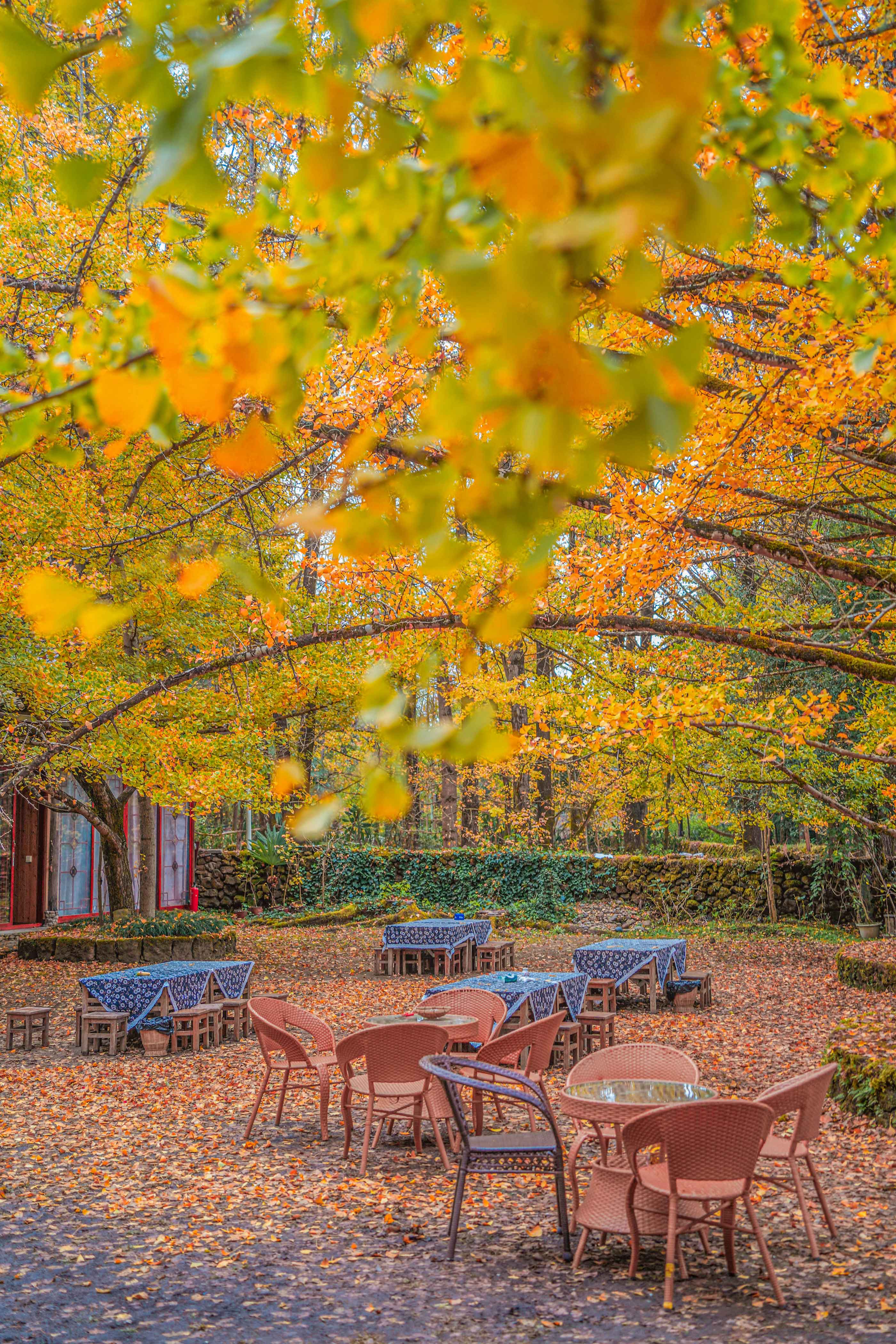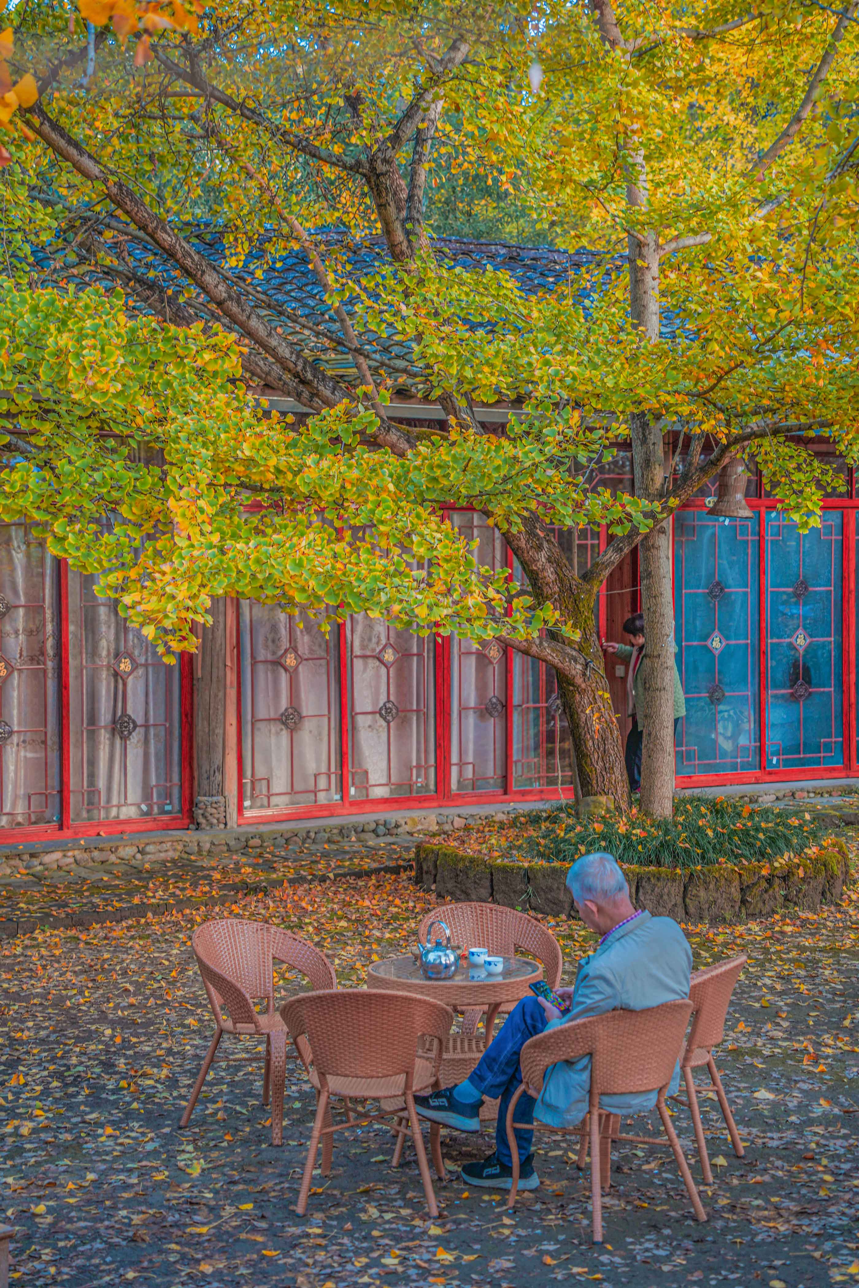 我们来不及细品那云南蓝染搭配金黄银杏的庭院美景,便迫不及待地融入这金色海洋。银杏叶是秋天最好的信使,气温越冷,它们的颜色越发明亮,可若气候骤冷,它们又来不及染黄便匆匆坠地。想象那一阵清风拂过,树叶如金色雨点般飘落,真是一场无法用语言形容的浪漫盛宴。