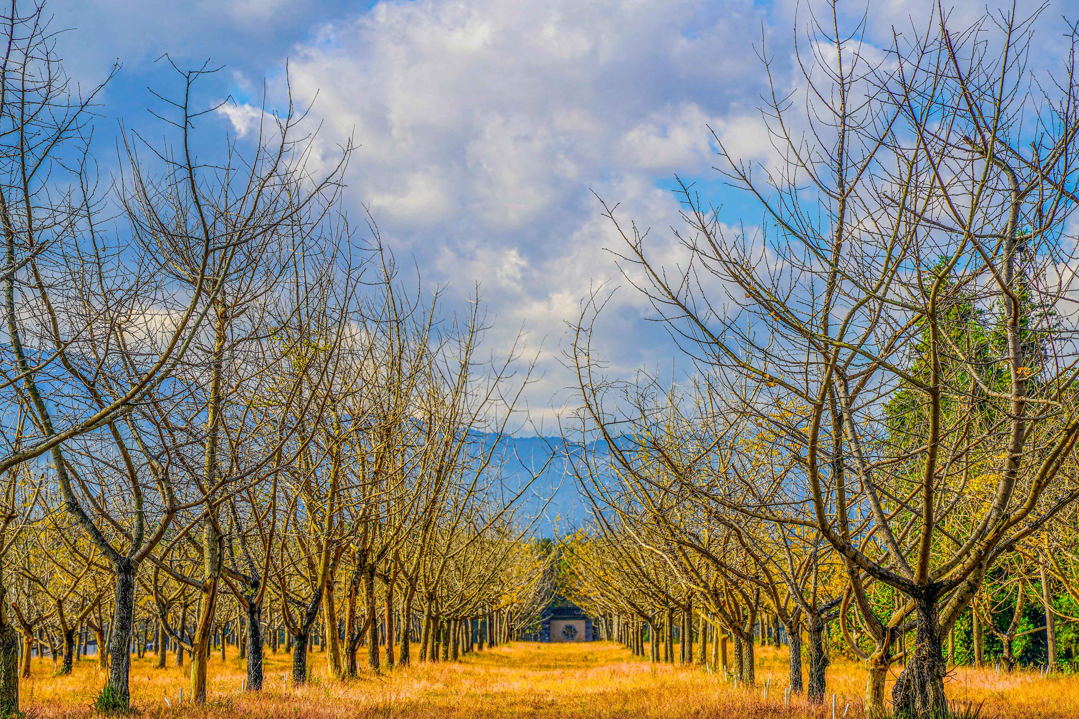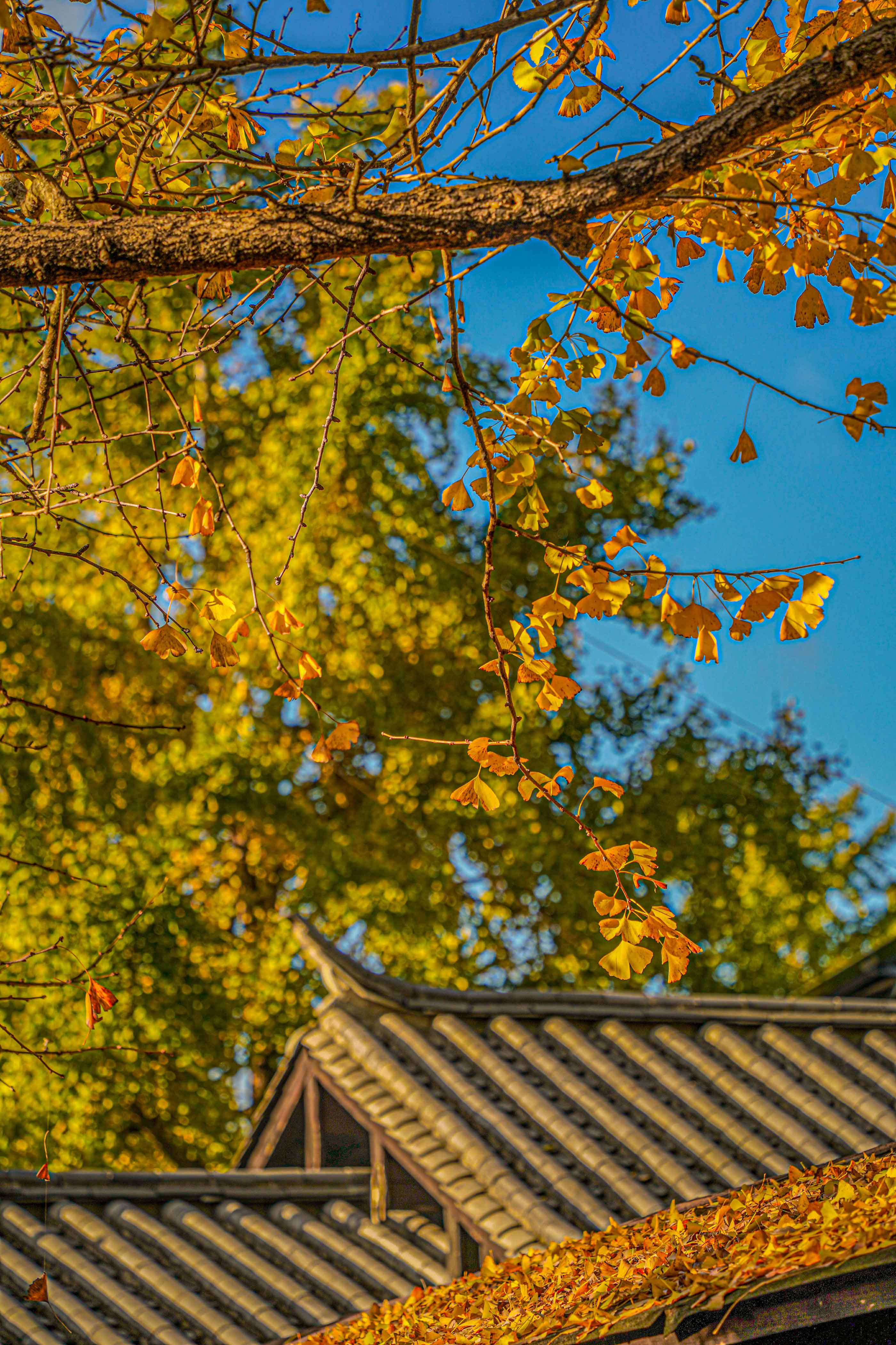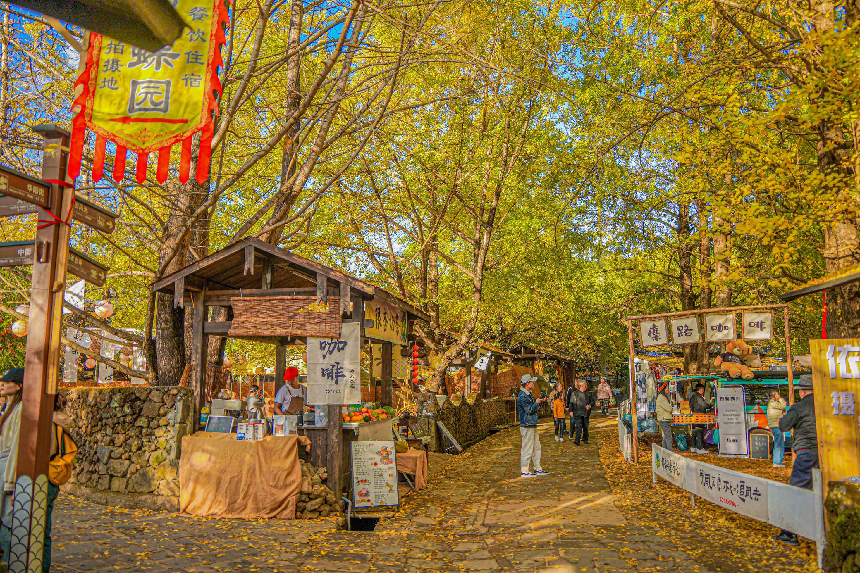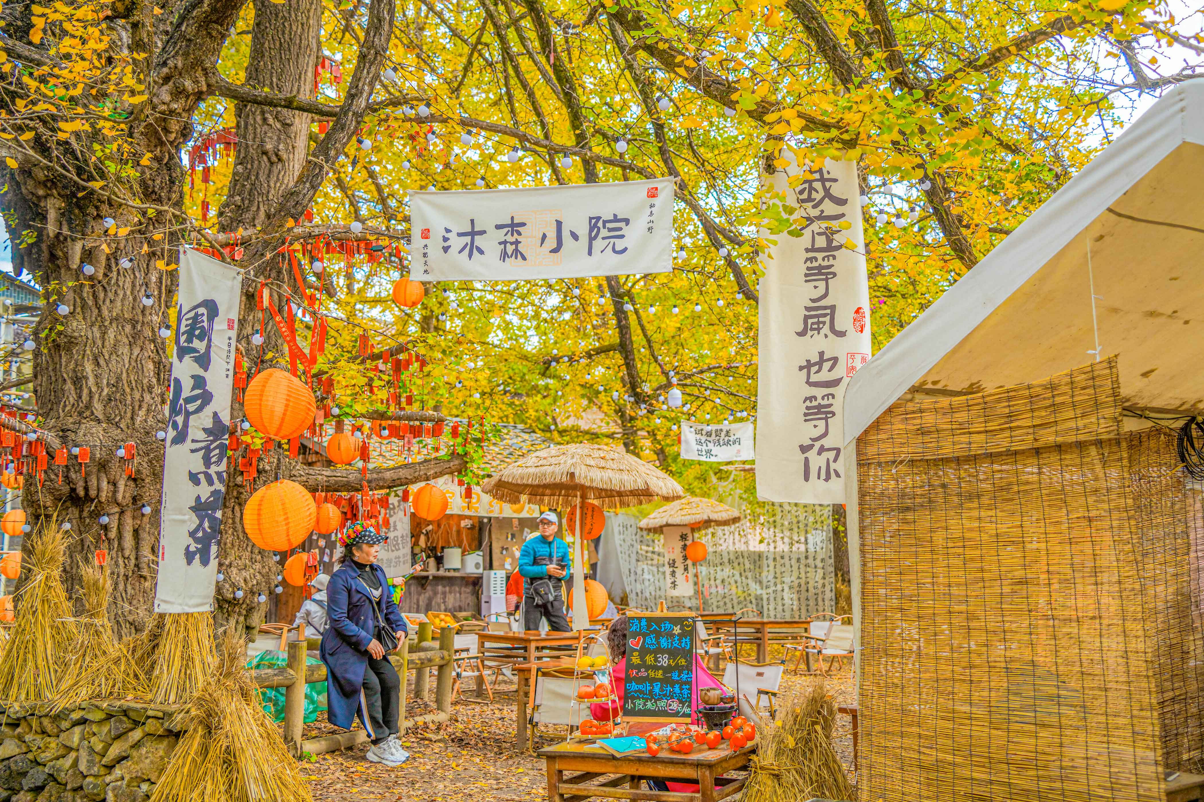 我们来不及细品那云南蓝染搭配金黄银杏的庭院美景,便迫不及待地融入这金色海洋。银杏叶是秋天最好的信使,气温越冷,它们的颜色越发明亮,可若气候骤冷,它们又来不及染黄便匆匆坠地。想象那一阵清风拂过,树叶如金色雨点般飘落,真是一场无法用语言形容的浪漫盛宴。